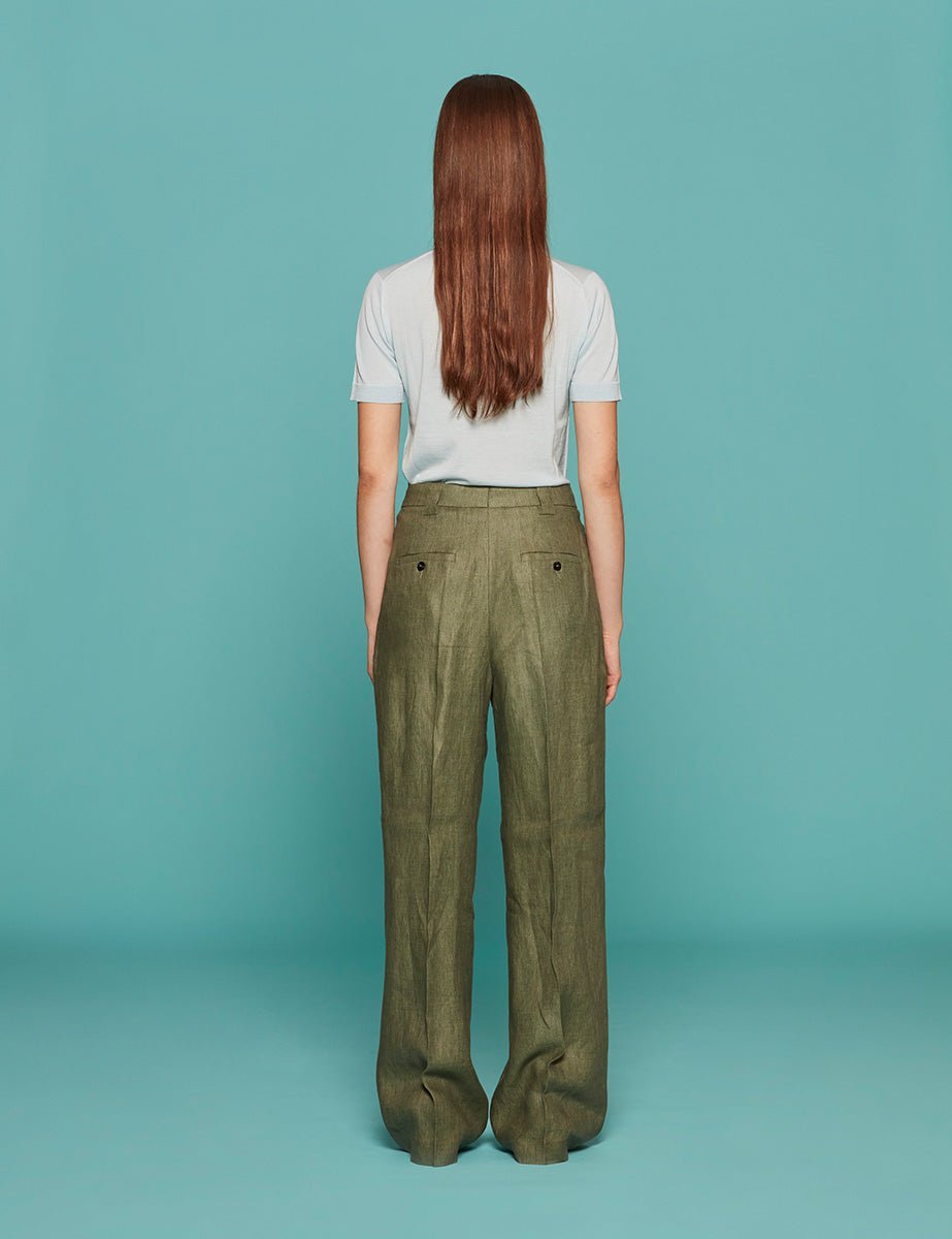 Pantapalazzo classico verde oliva con piega stirata davanti e dietro. Cinturino chiusura a gancio e zip con passanti in vita, tasche nel fianco e sul retro due tasche, filetto chiusura con bottone.
