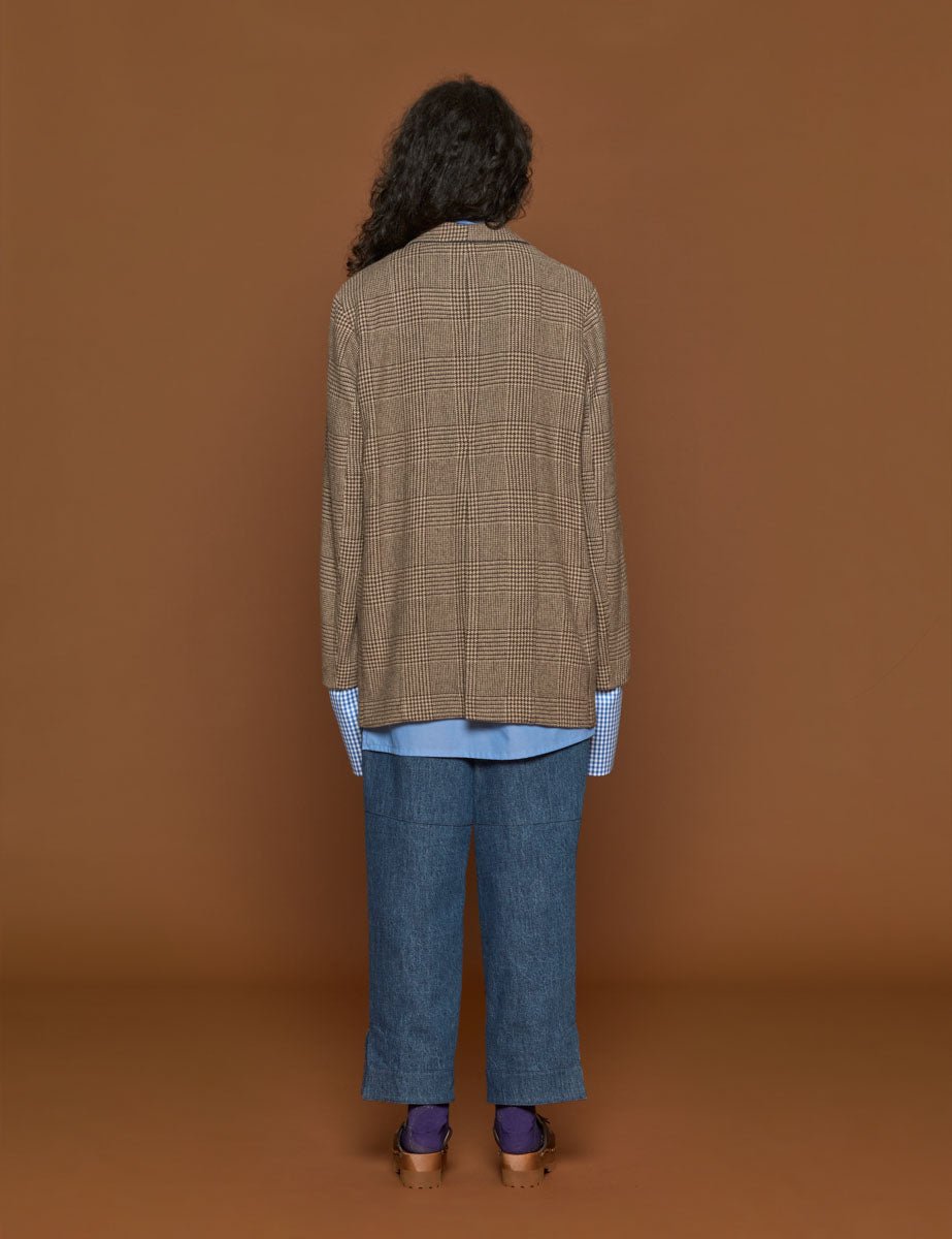Blazer in lana galles color moro, collo revers, spalla scesa, tasche a patta sui lati, polsini check removibili in popeline blu e bianco e spacco centrale sul retro.