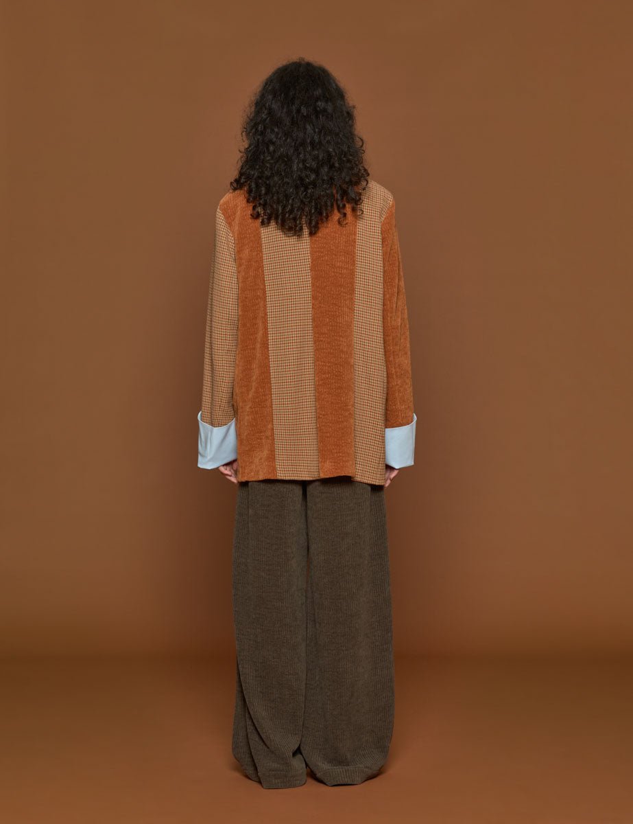 Blazer color miele patchwork in lana galles check e velluto a coste, collo revers, abbottonatura monopetto con bottoni a contrasto, tasche a patta laterali e tasca applicata sulla sinistra, polsini removibili in popeline.