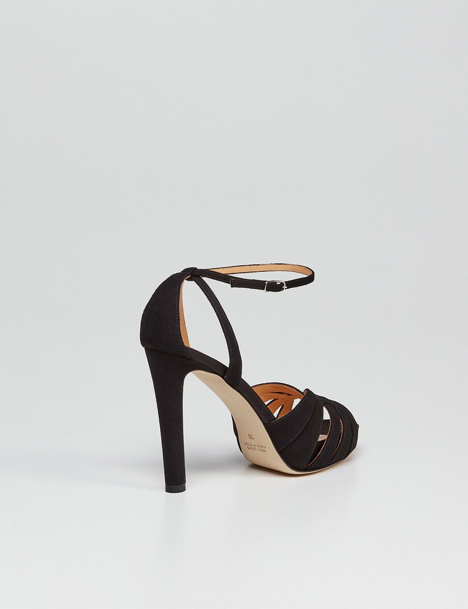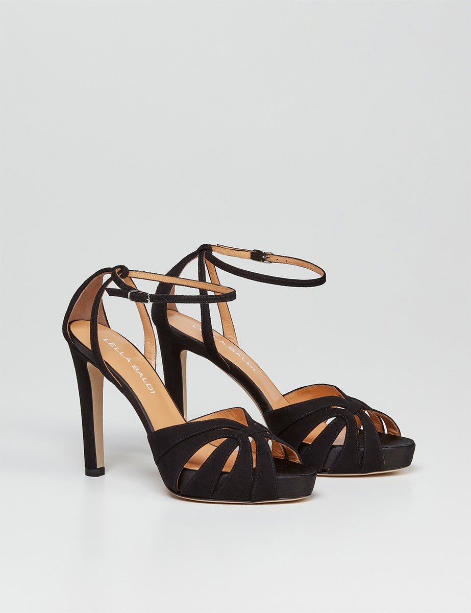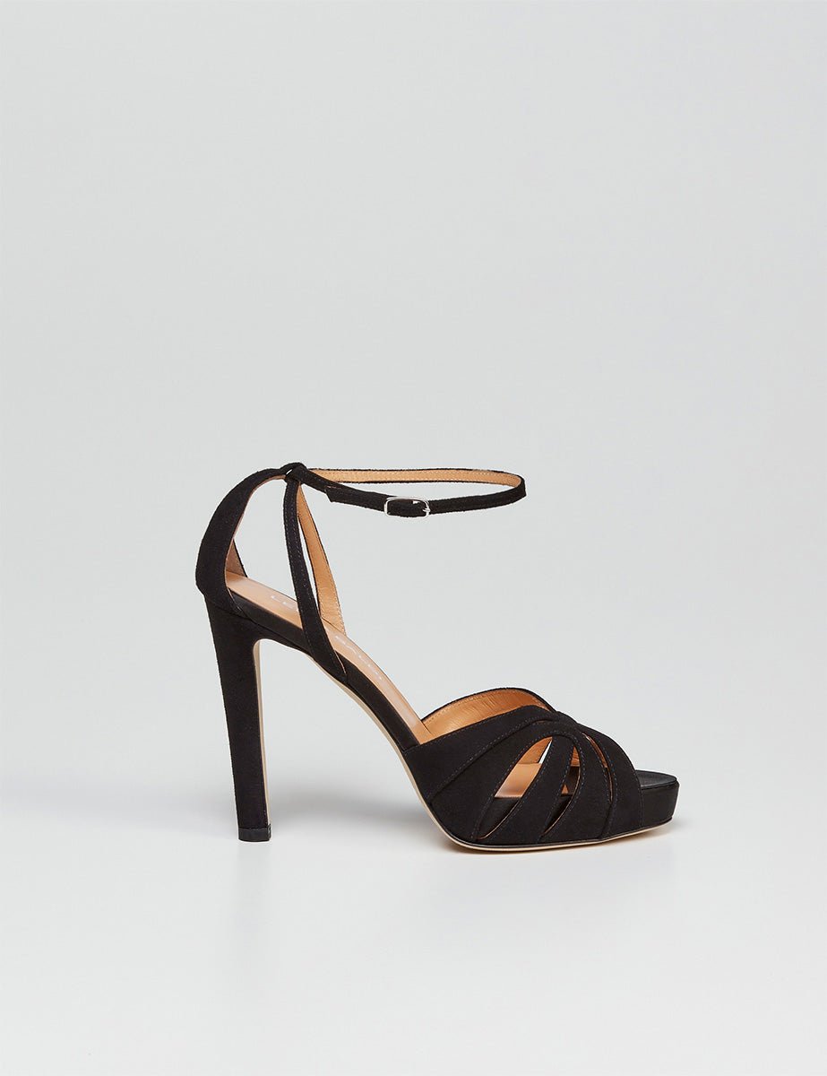 Sandalo in vera pelle scamosciata nera, dettagli di lacci intrecciati sul davanti e cinturino regolabile alla caviglia. Punta tonda e tacco a spillo.