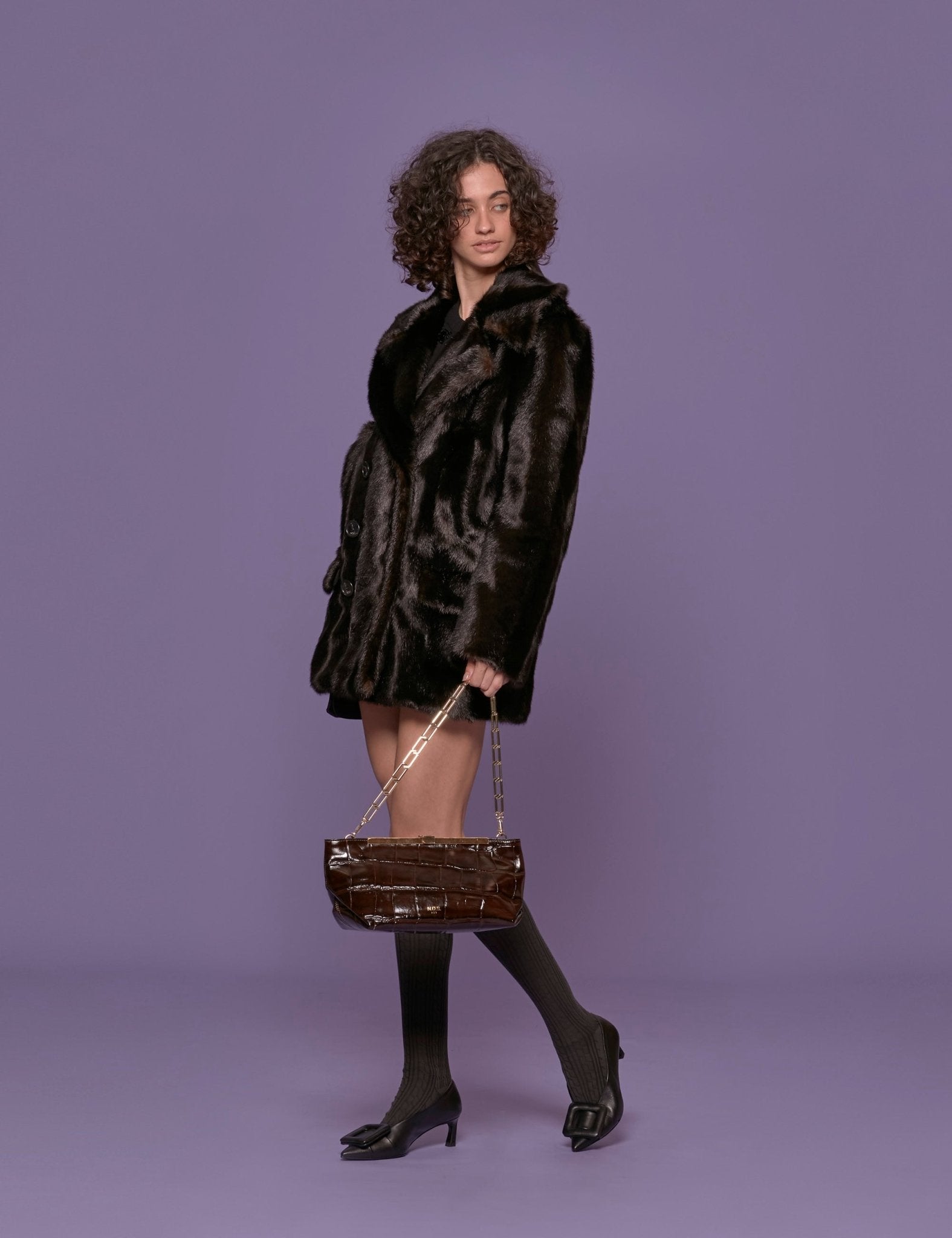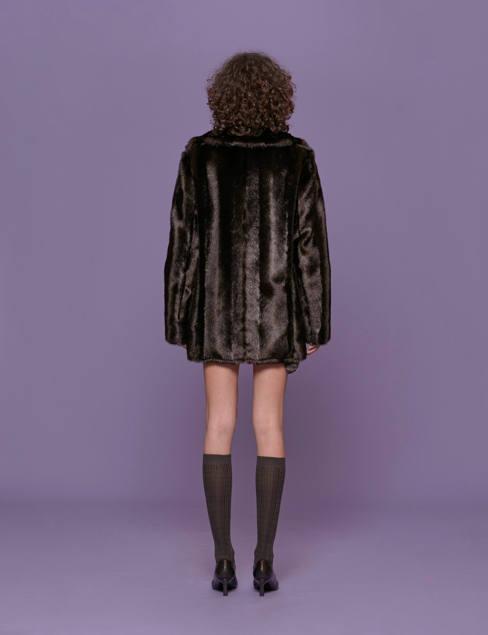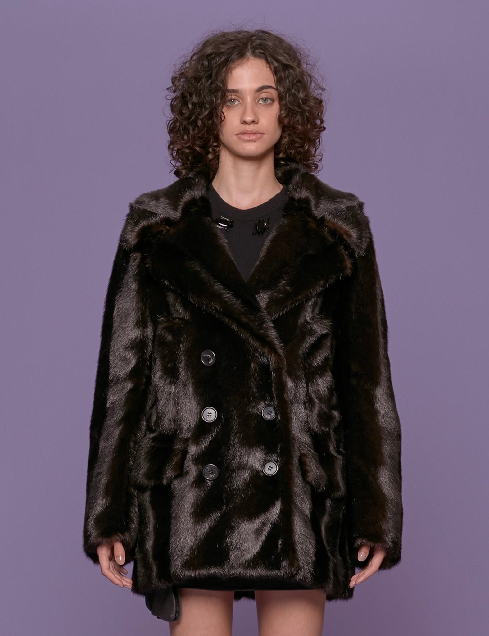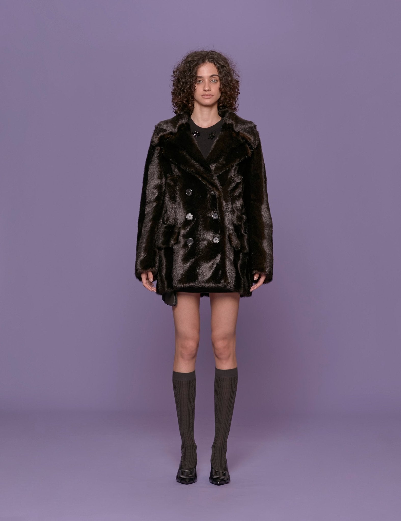 Caban ecofur marrone targato Alessandro dell'Acqua. Presenta rever ampio, tasche sul davanti e chiusura doppiopetto.