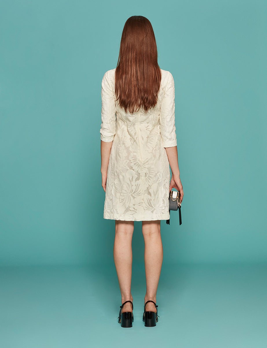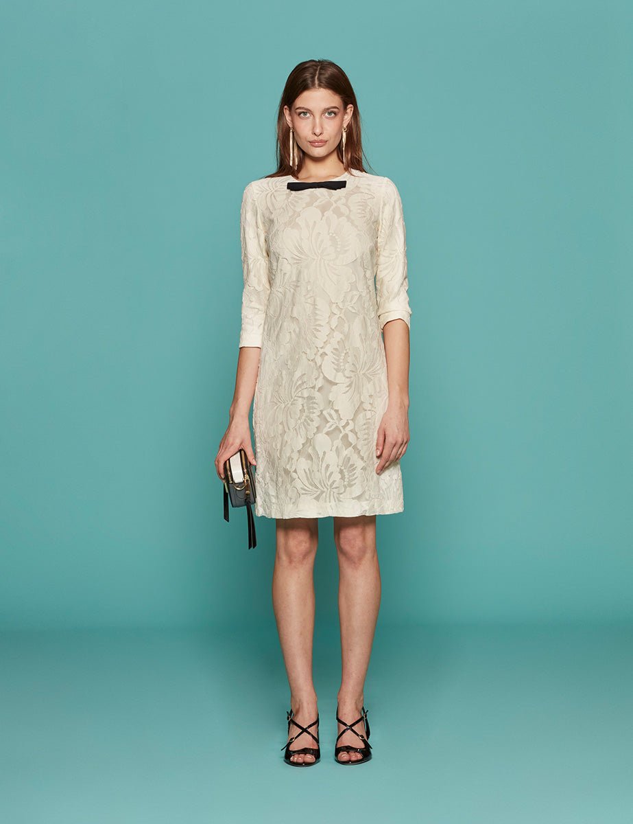 Minidress in pizzo rebrodè macro fiore color latte. Maniche a 3/4, fiocco nero sullo scollo e chiusura zip invisibile sul retro, fit 60’s.