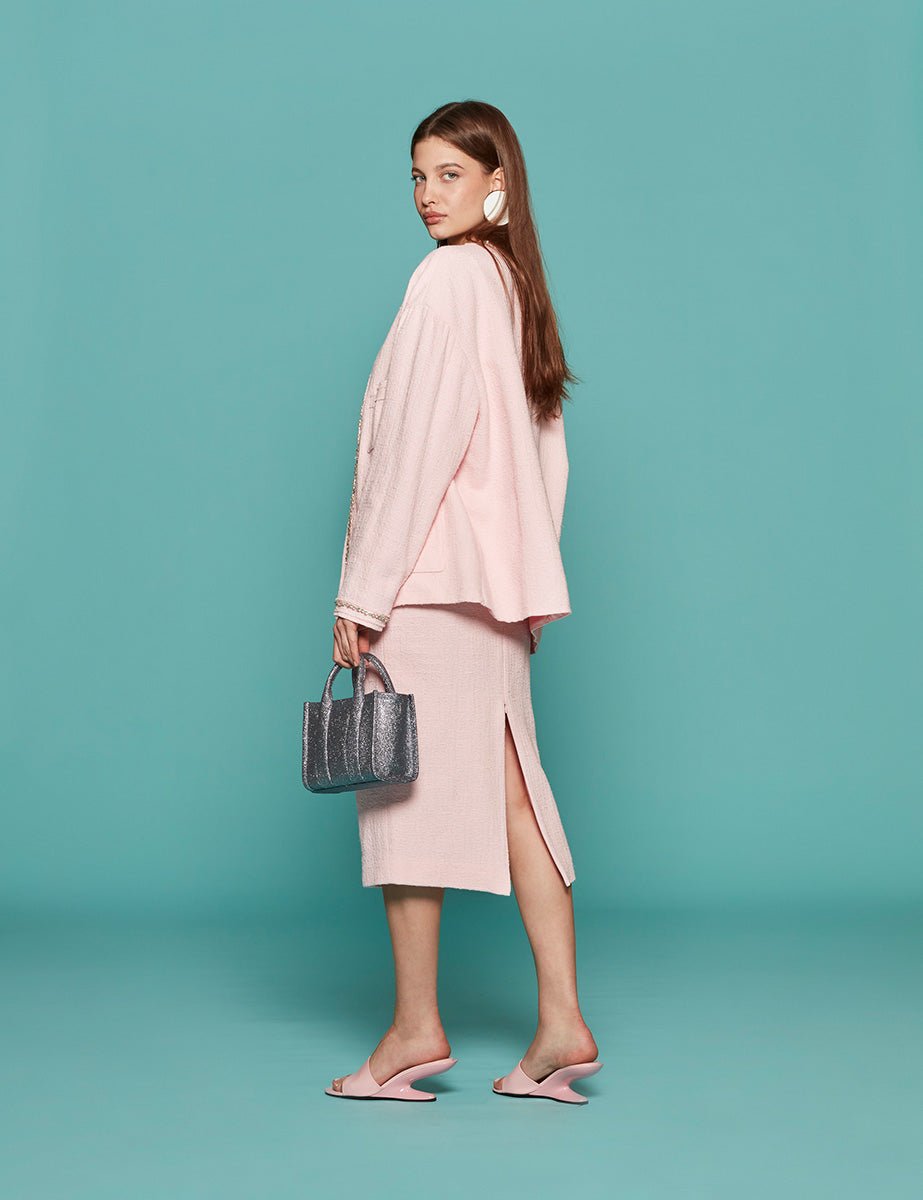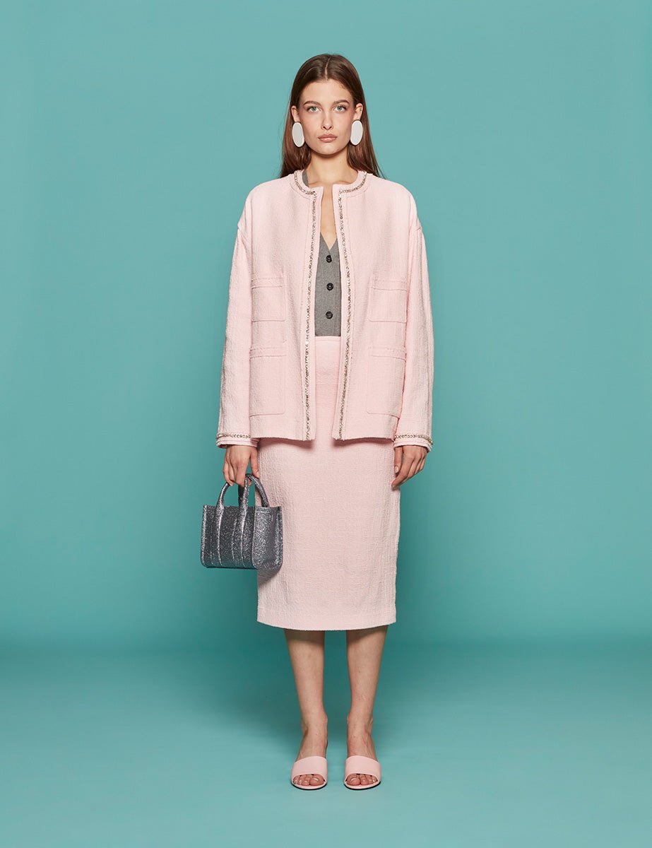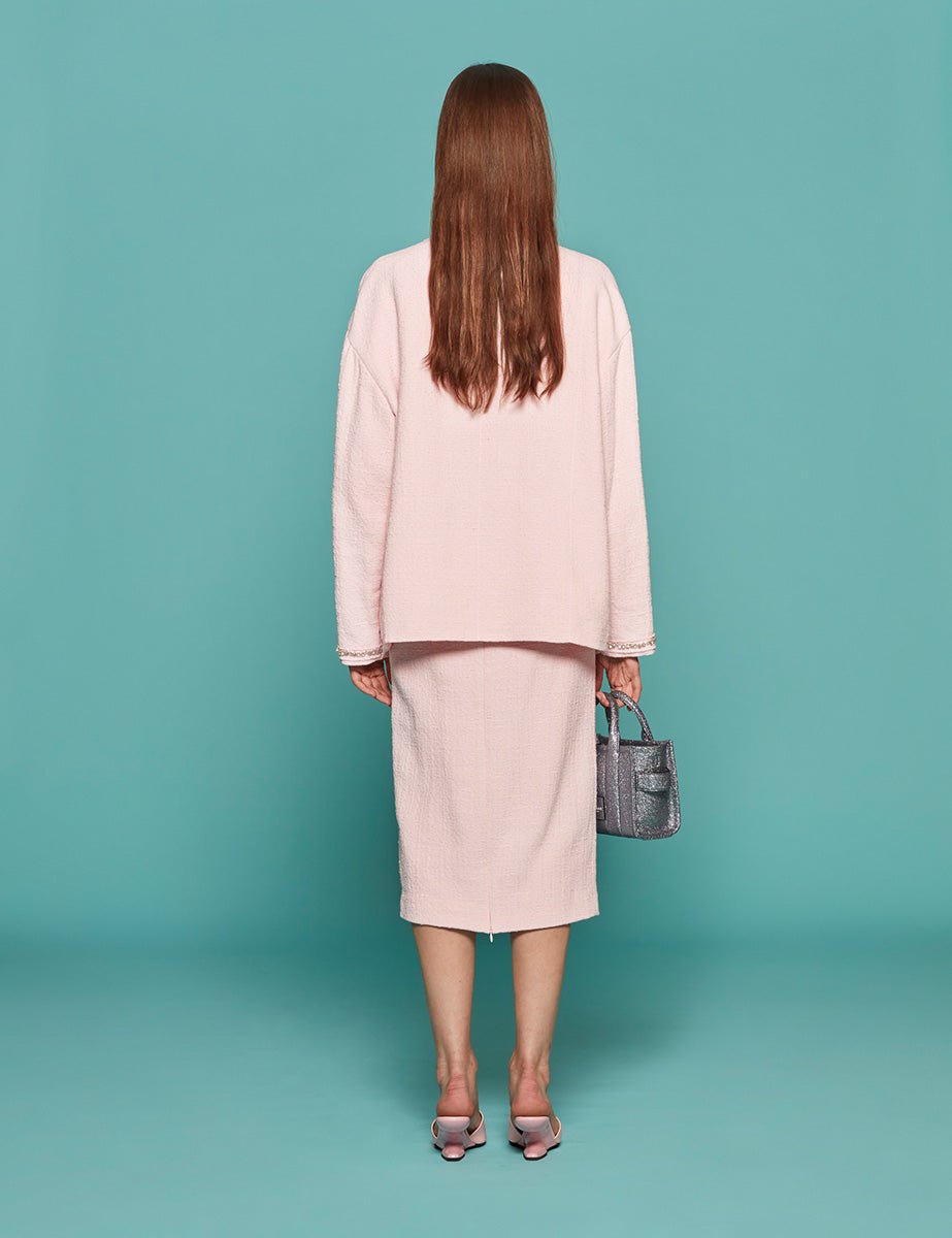Giacca classica bouclè monocromo rosa con girocollo fit over. Ricamo su apertura e polsi con cristalli, spalla leggermente arricciata e tasche applicate davanti.
