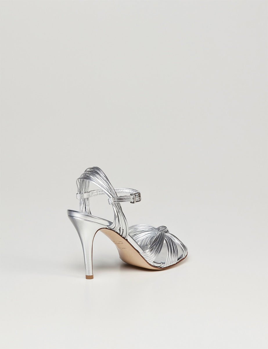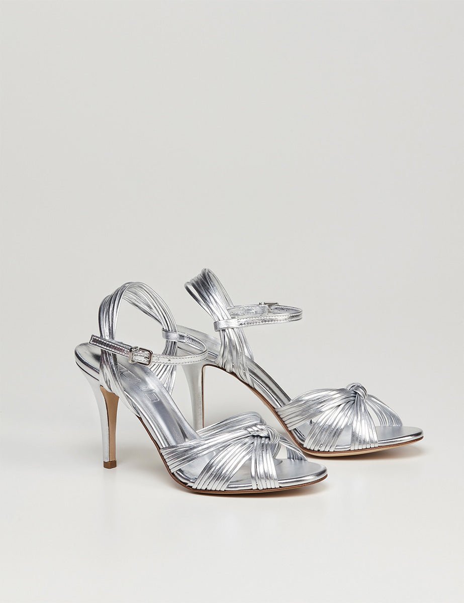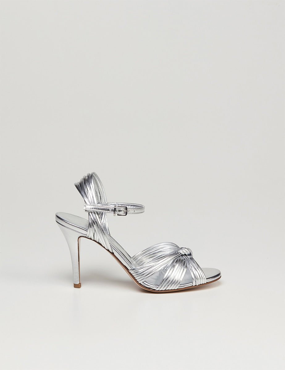 Sandalo laminato in vera pelle argento, aperto sul davanti con dettagli lacci incrociati sul davanti e alla caviglia, cinturino con fibbia regolabile. Punta tonda e tacco a spillo.
