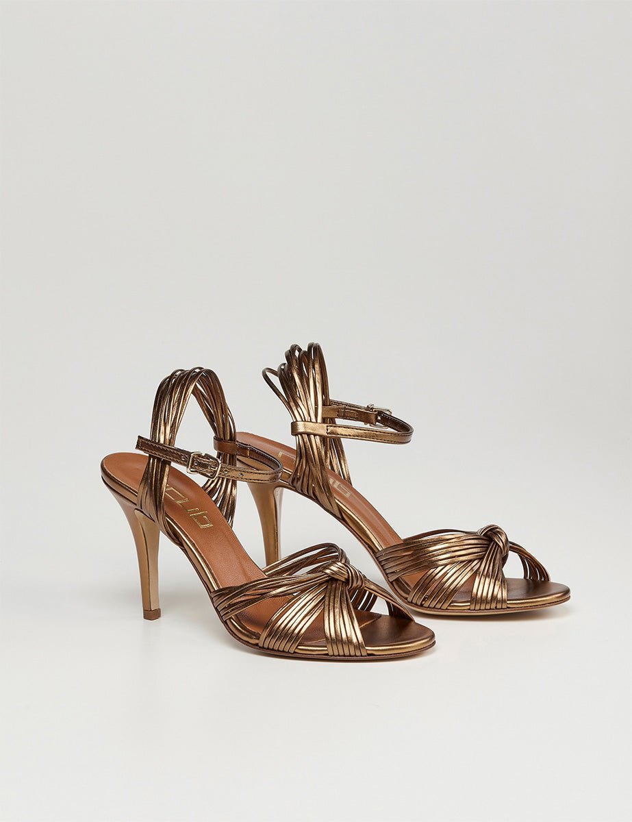 Sandalo laminato in vera pelle bronzo aperto sul davanti con dettagli lacci incrociati sul davanti e alla caviglia, cinturino con fibbia regolabile. Punta tonda e tacco a spillo.