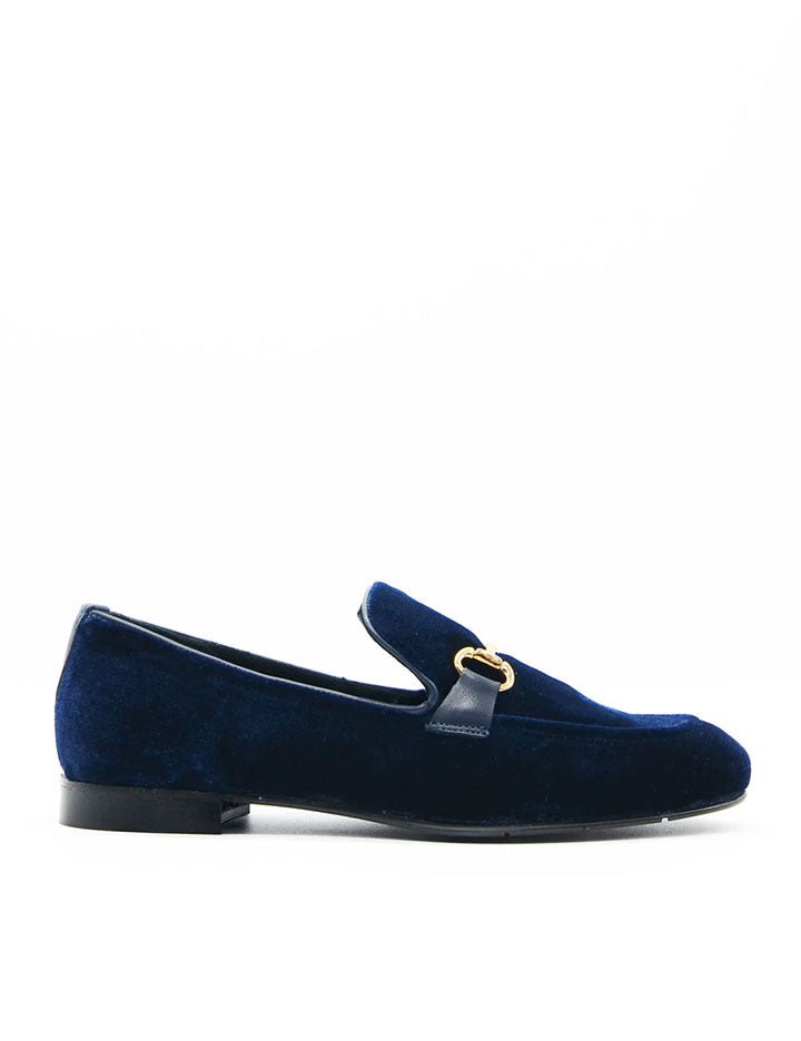 Mocassino in velluto blu con suola in gomma e interno in pelle. Presenta morsetto oro.