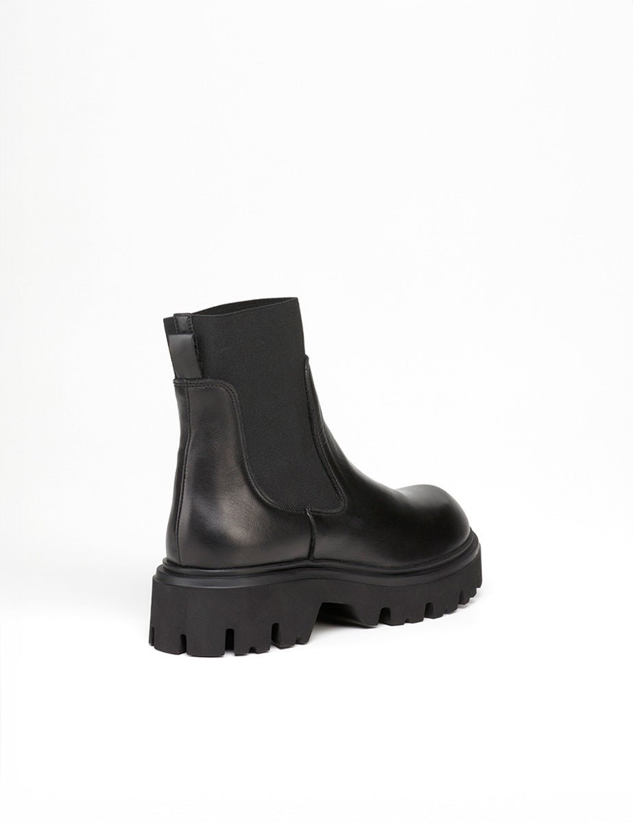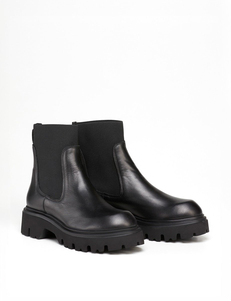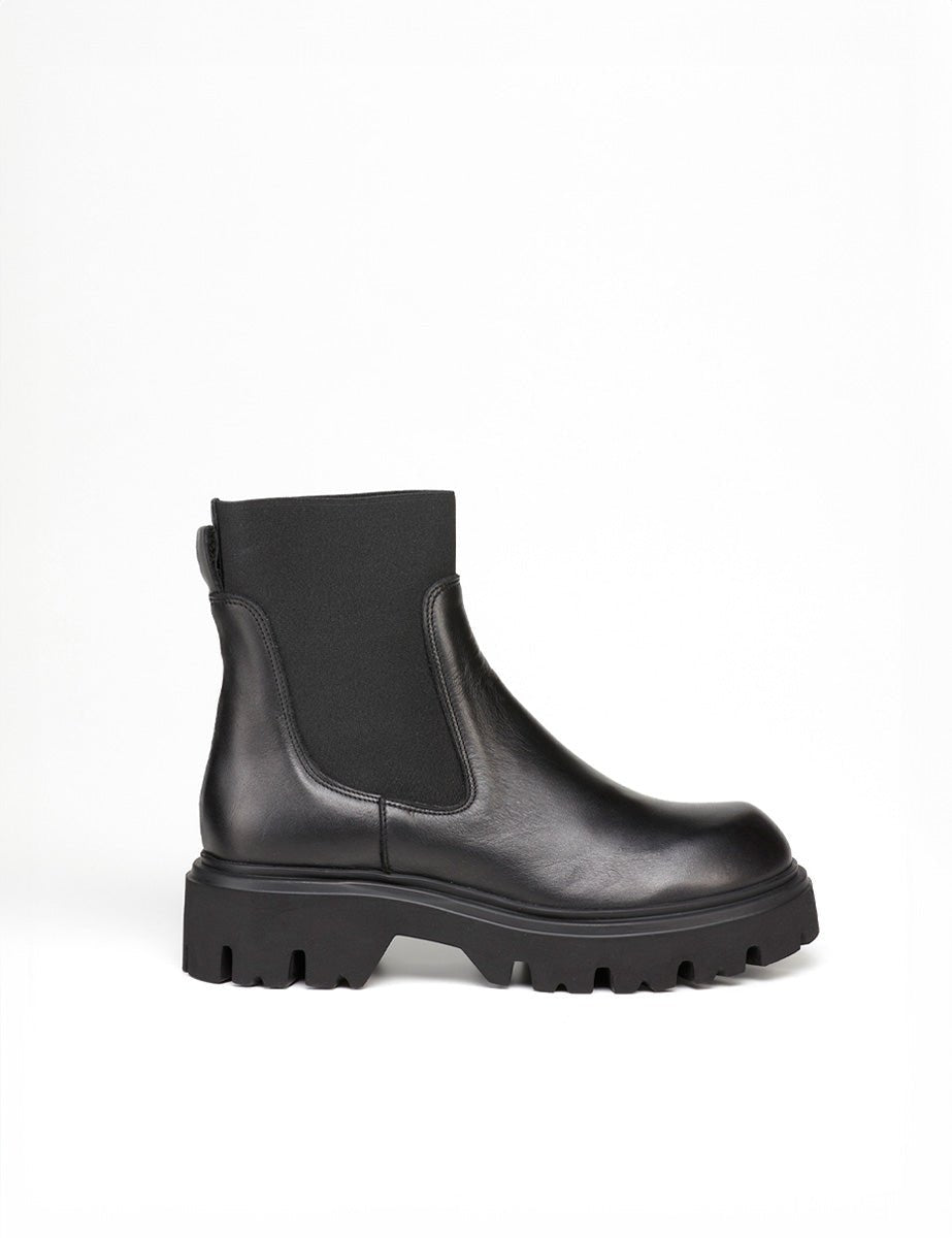 Stivaletto Beatles in vera pelle nera, pratico elastico alla caviglia in tono, punta tonda, suola carrarmato e linguetta al tallone.
