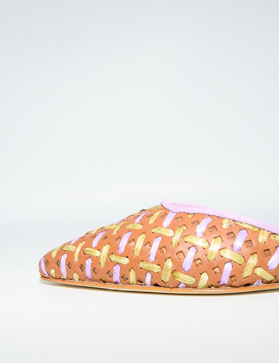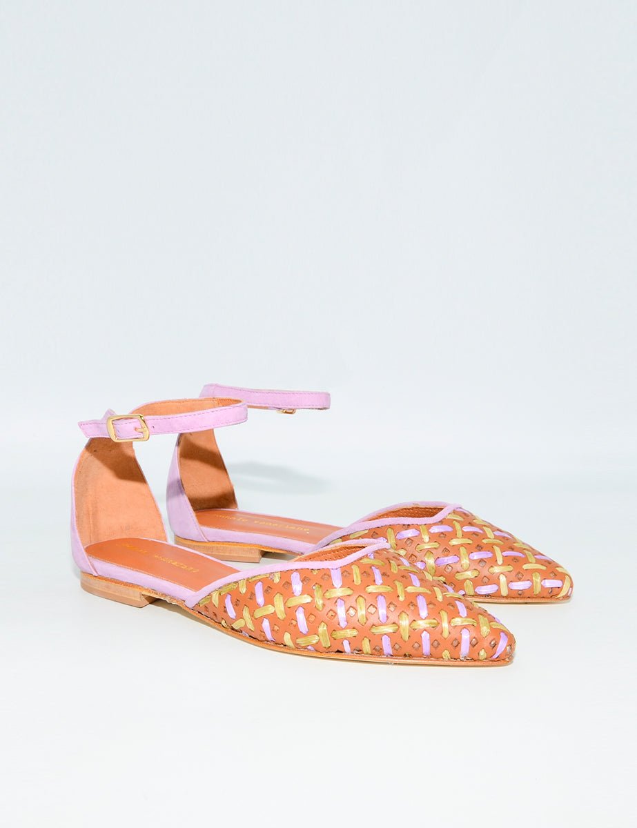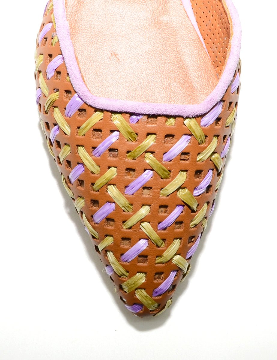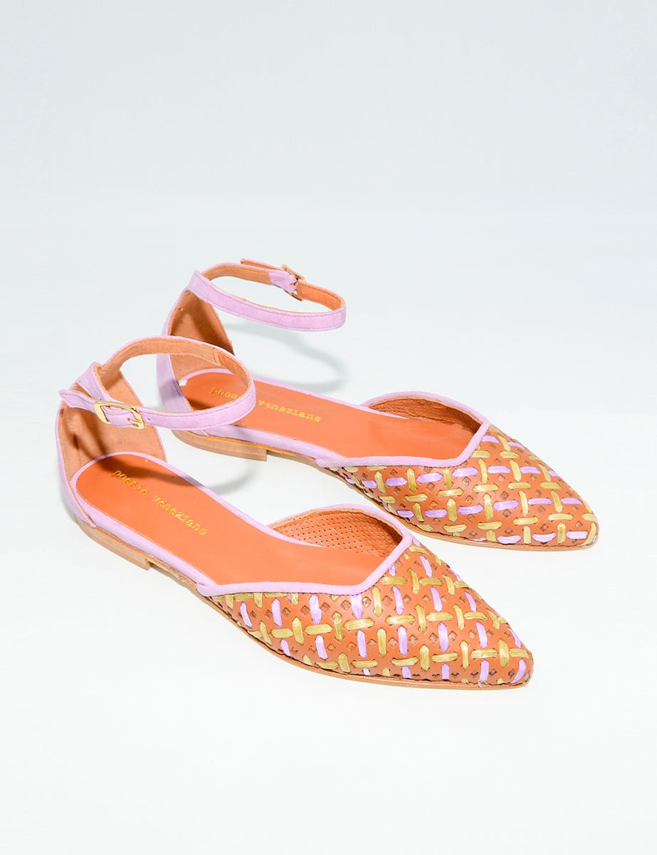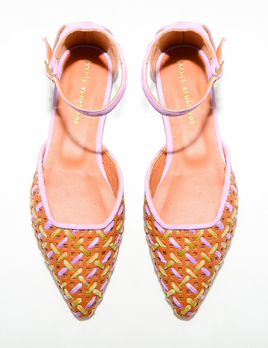 Ballerina in vera pelle marrone cuoio forata con dettagli di intrecci verde acido e viola glicine, cinturino viola in tono regolabile alla caviglia. Punta tonda tacco basso impilato.