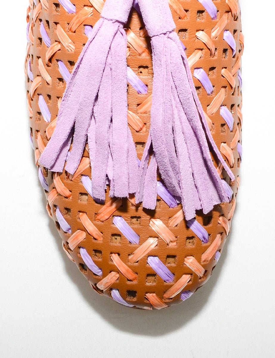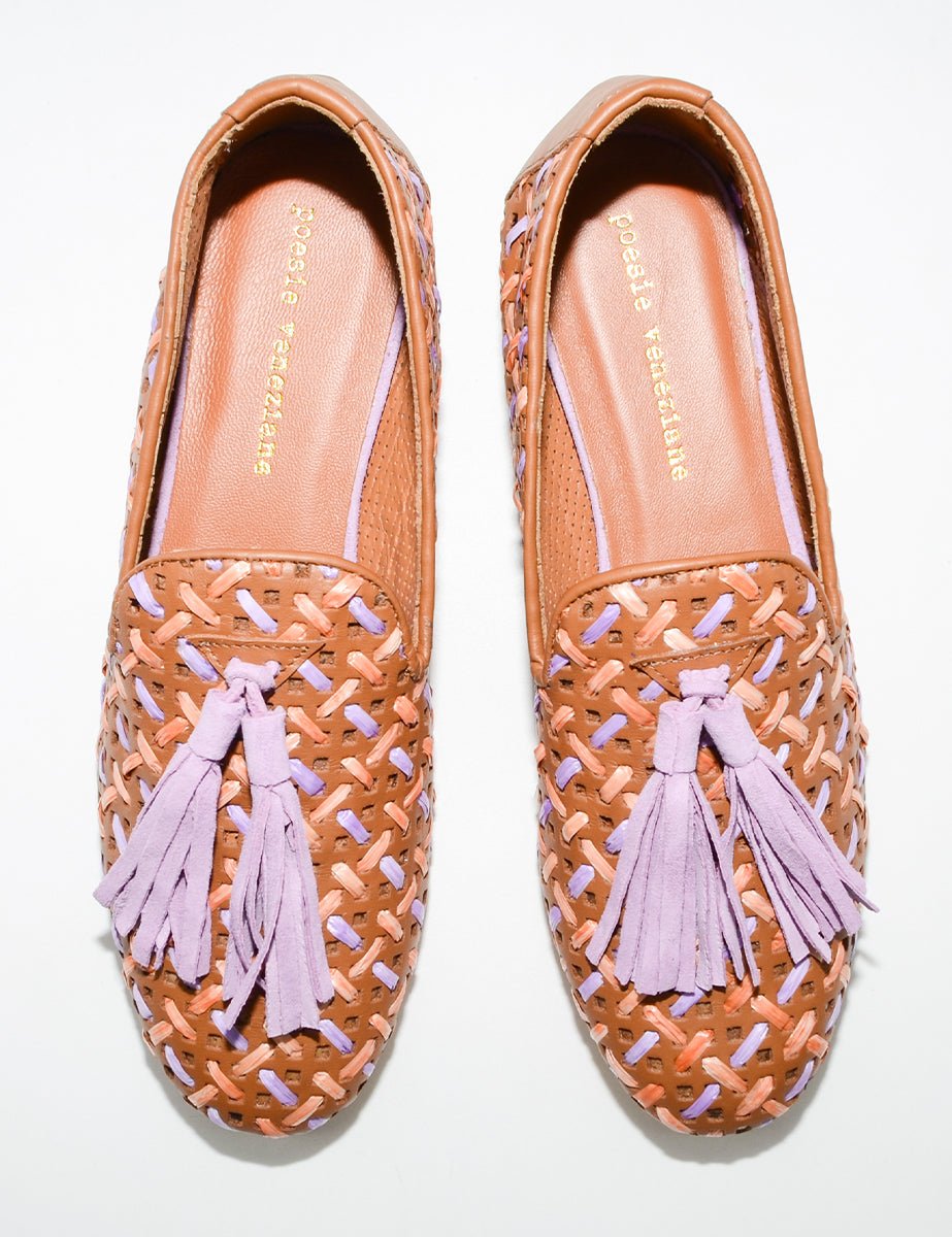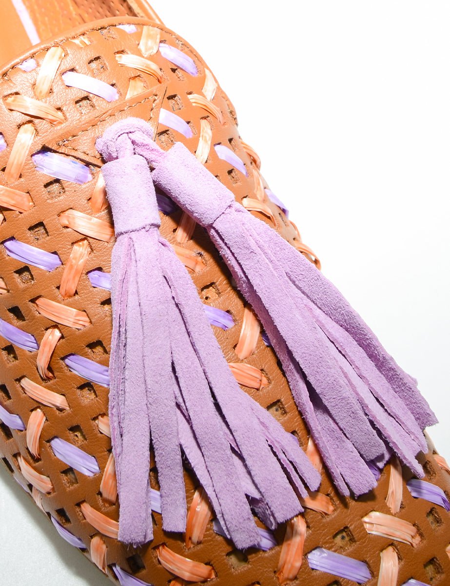Mocassino in vera pelle marrone cuoio forata con dettagli di intrecci rosa salmone e viola glicine, nappa scamosciata in cuoio viola in tono, punta tonda.