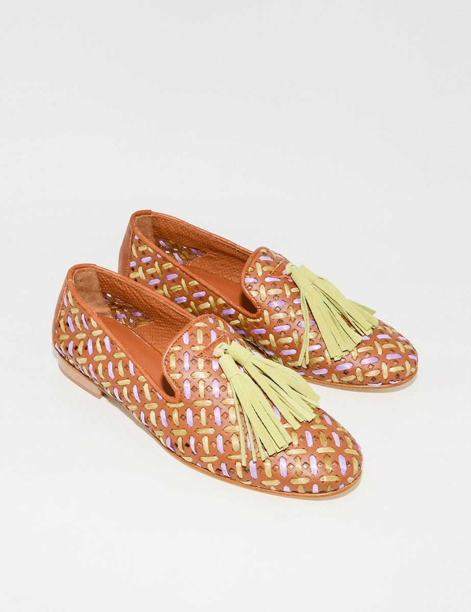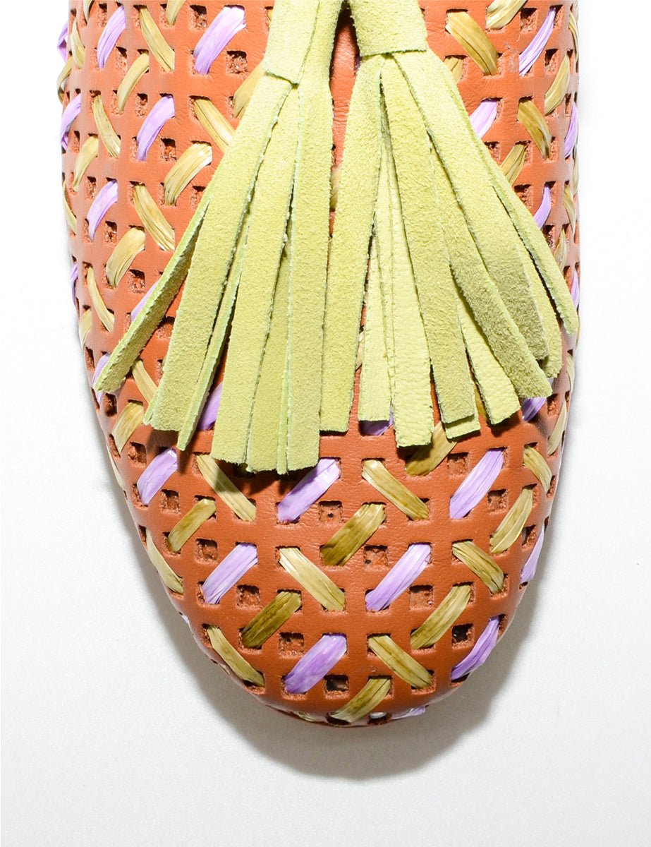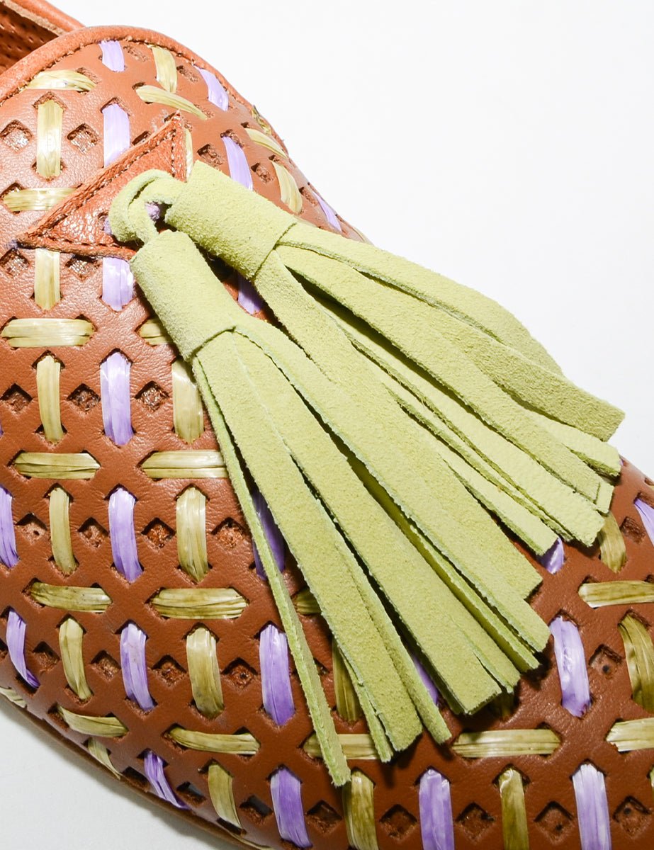 Mocassino in vera pelle marrone cuoio forata con dettagli di intrecci verde acido e viola glicine, nappa scamosciata in cuoio verde in tono, punta tonda.