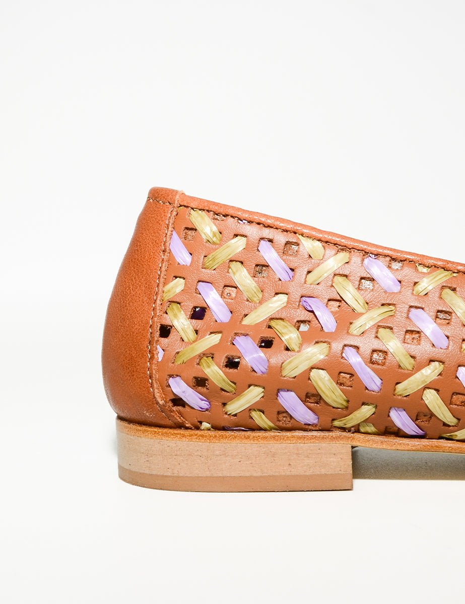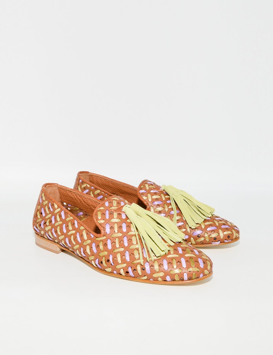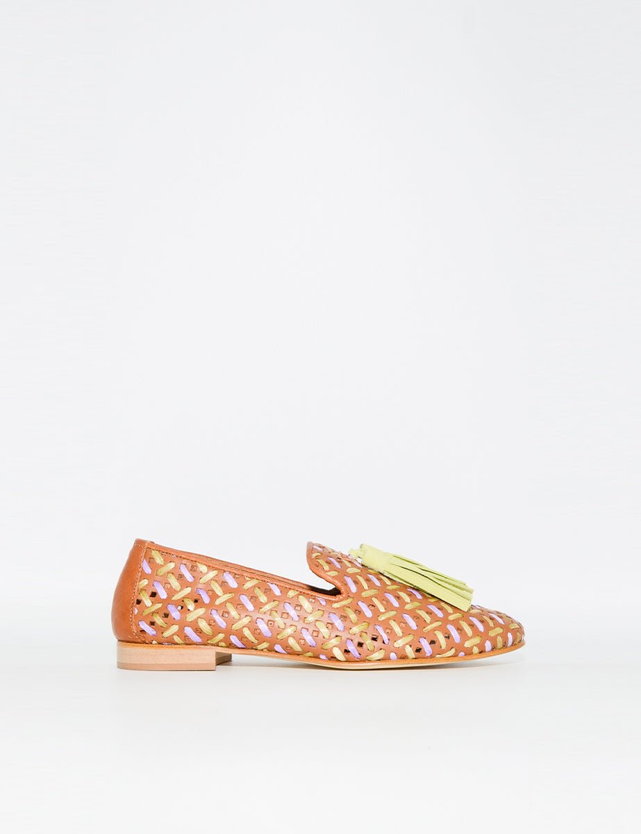 Mocassino in vera pelle marrone cuoio forata con dettagli di intrecci verde acido e viola glicine, nappa scamosciata in cuoio verde in tono, punta tonda.