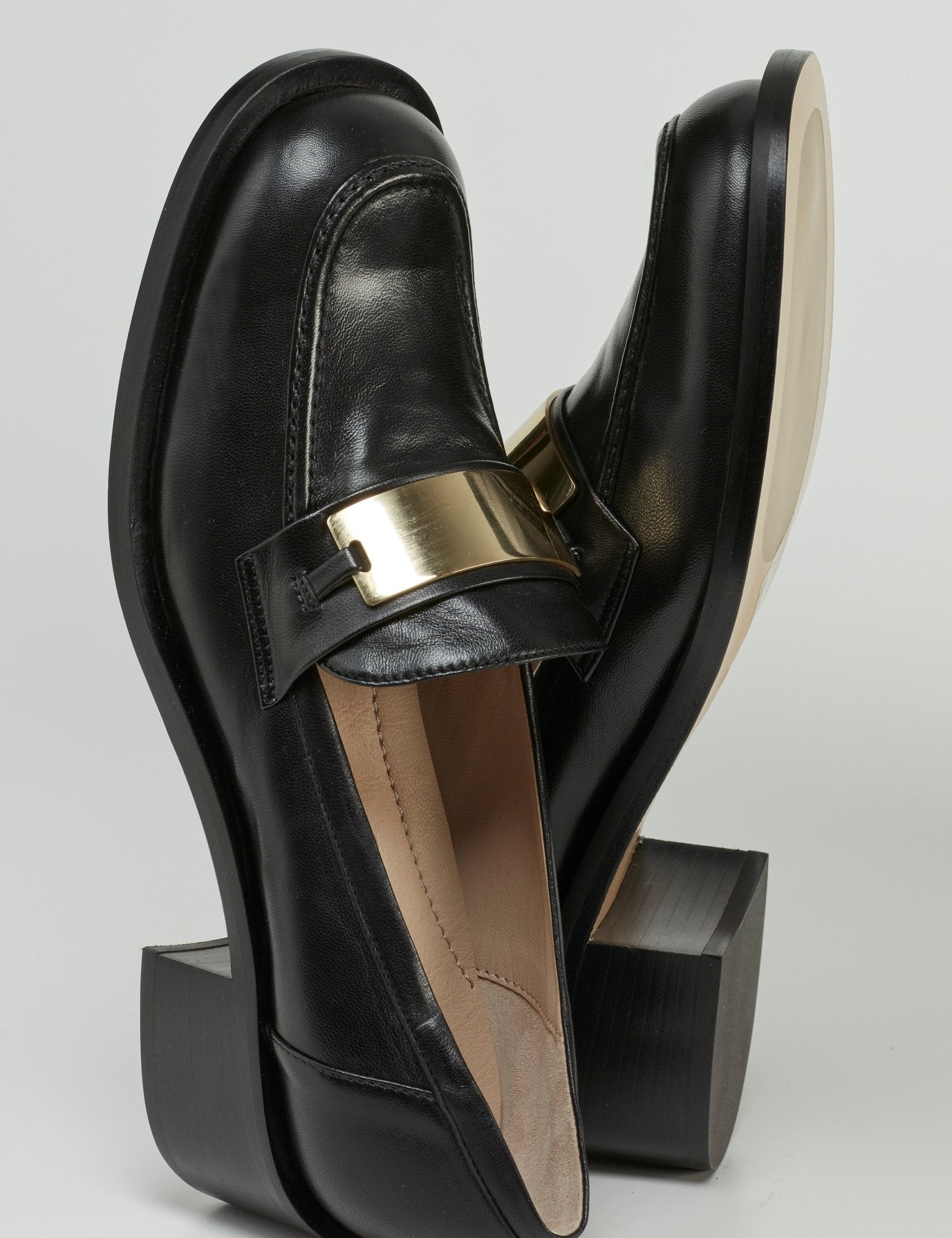 Mocassino con tacco in pelle nera con banda oro sul davanti. Presenta tacco largo di 6cm.