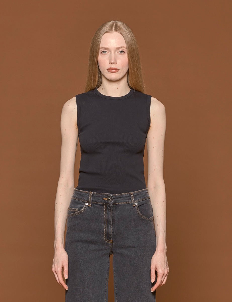 Canotta classica bianca smanicata, girocollo a costine, lunghezza e vestibilità regular.