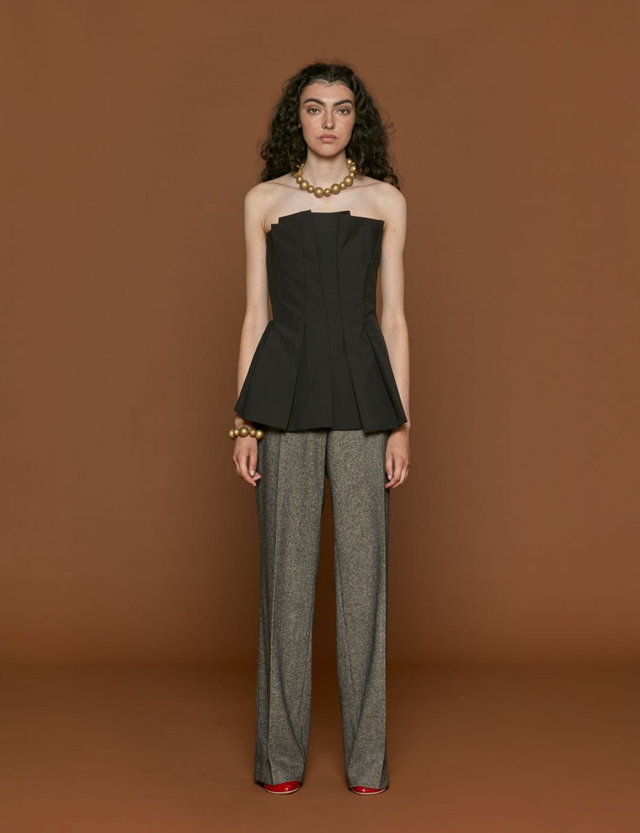 Bustier in cotone nero a pieghe, senza spalline, orlo asimmetrico, dettagli plissettati e chiusura laterale con zip.