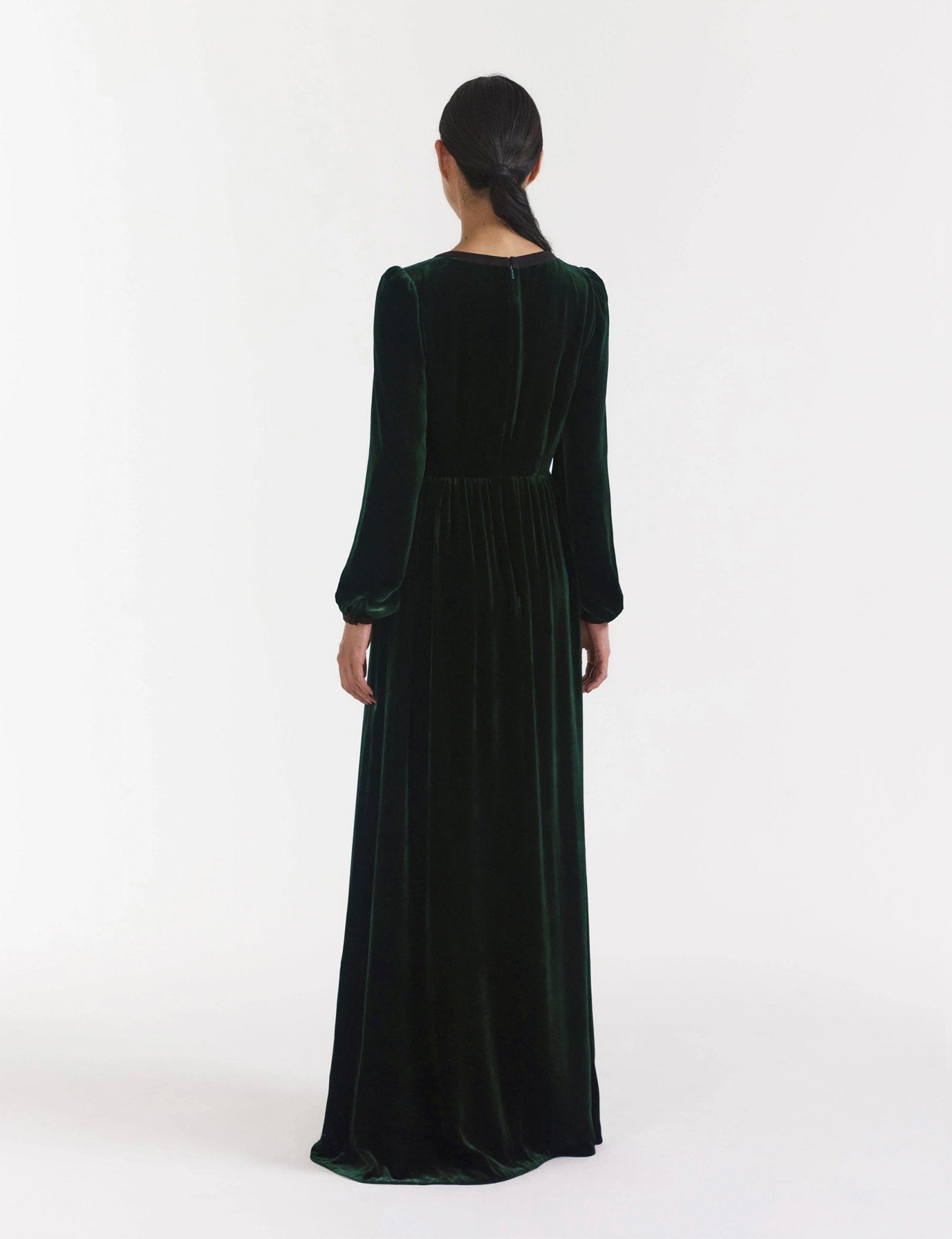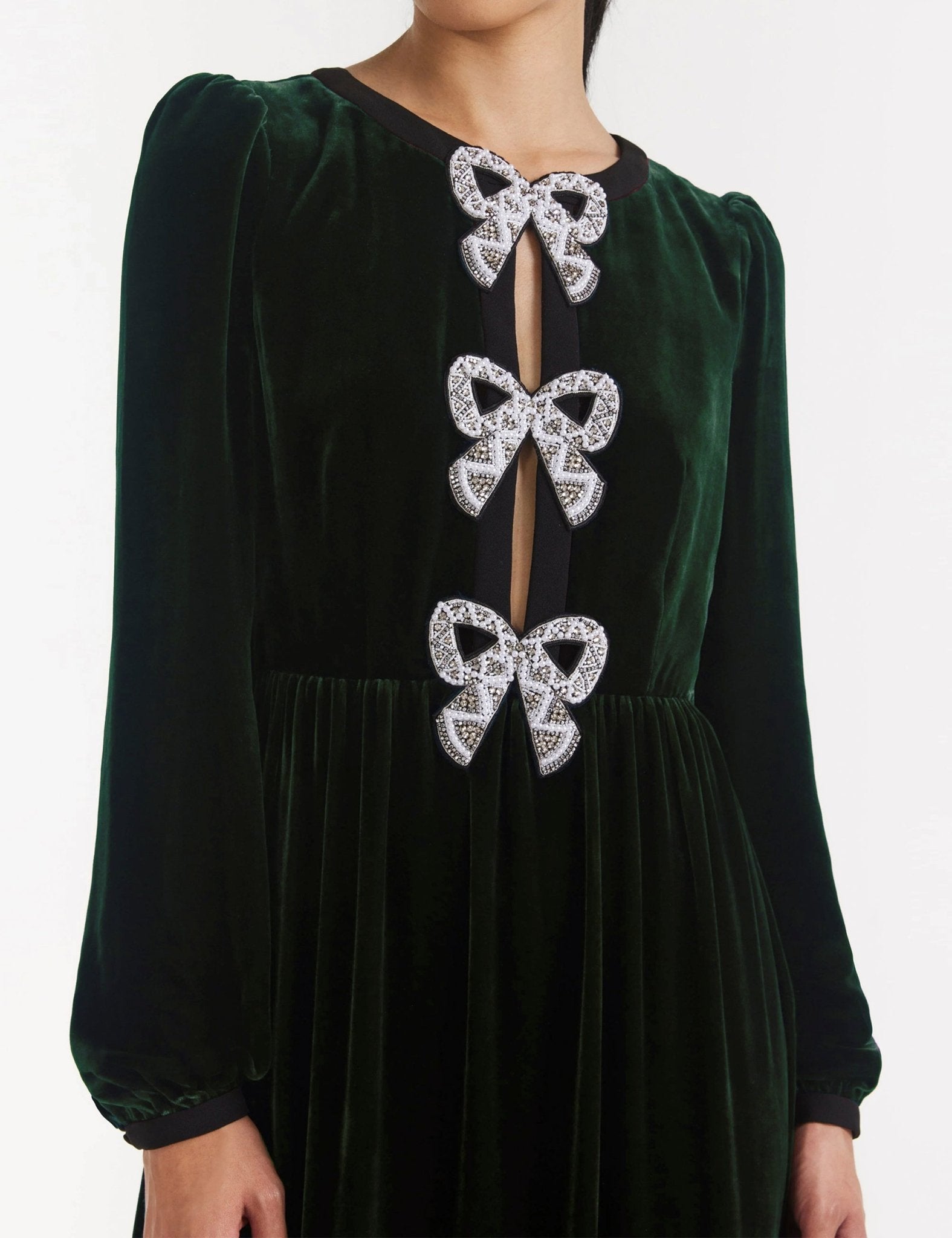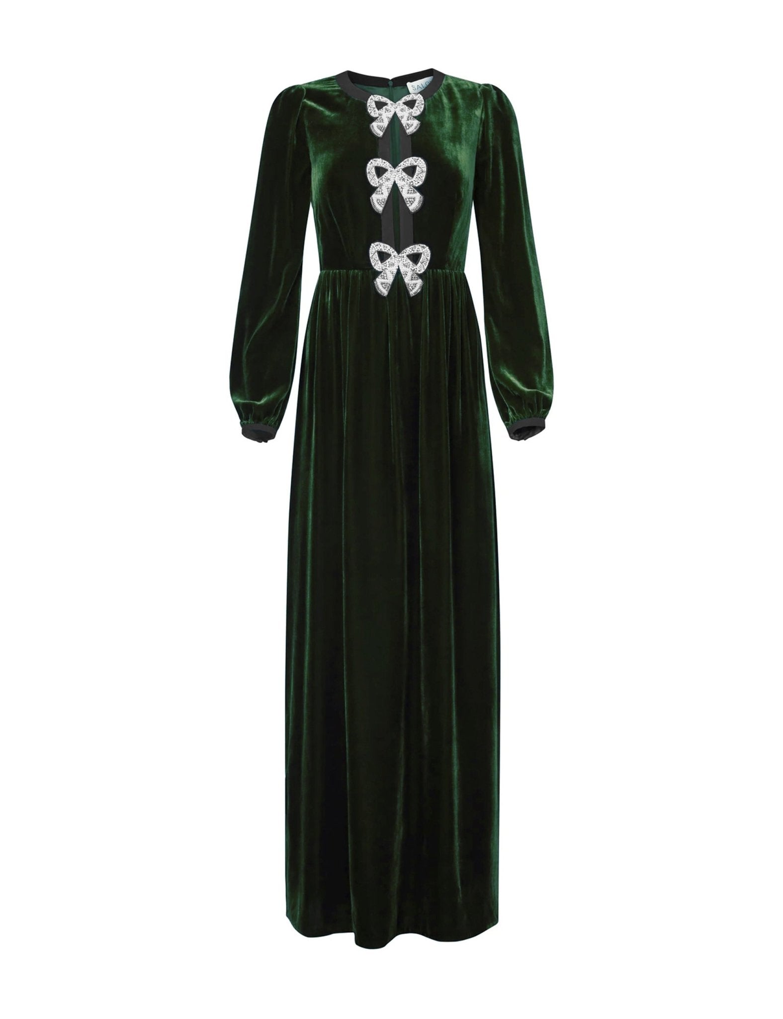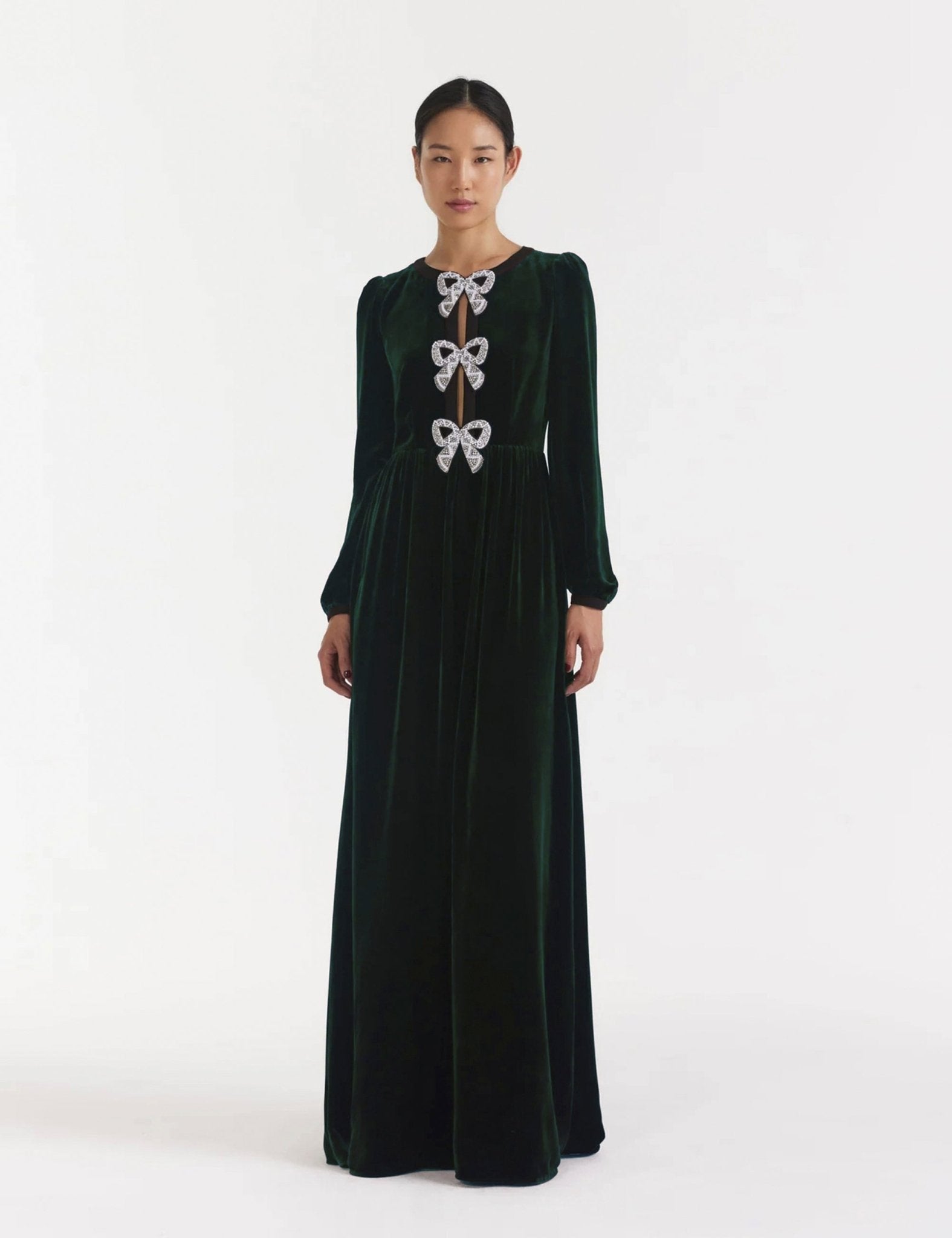 Abito lungo Camille in velluto liquido, con taglio in vita arricciato che lascia il posto a una gonna fluida, applicazioni di fiocchi decorati con perle e cristalli, aperture a serratura tra gli archi, rifinitura della fascia in crèpe sullo scollo a contrasto. Maniche lunghe con dettagli arricciati, polsini con bottone a contrasto e gonna intera raccolta in vita, completamente foderato.