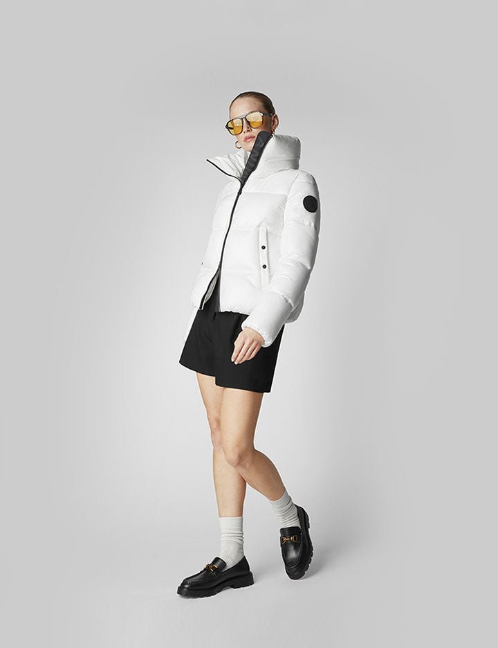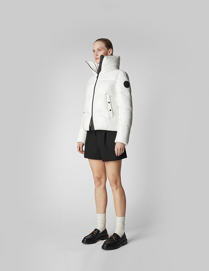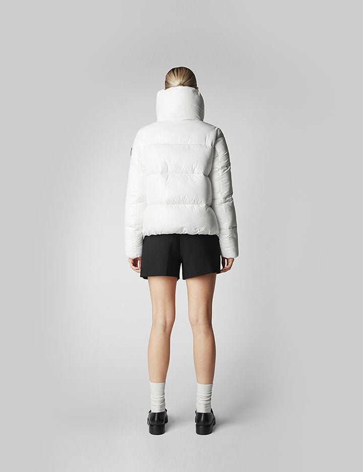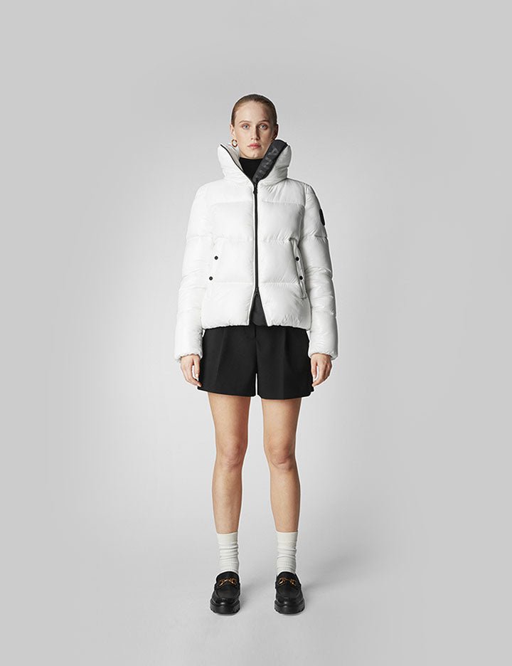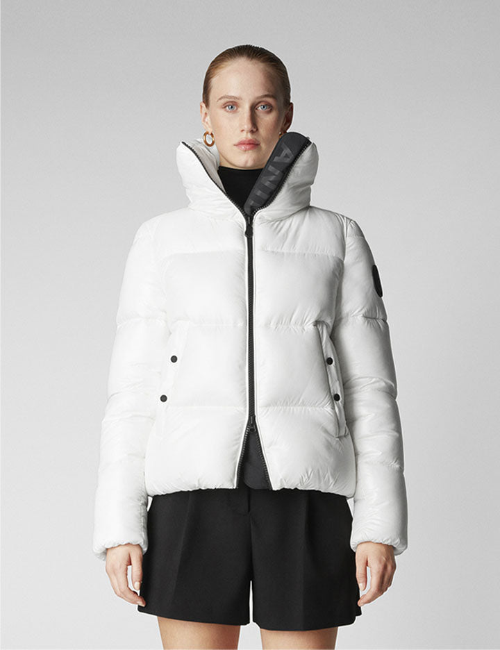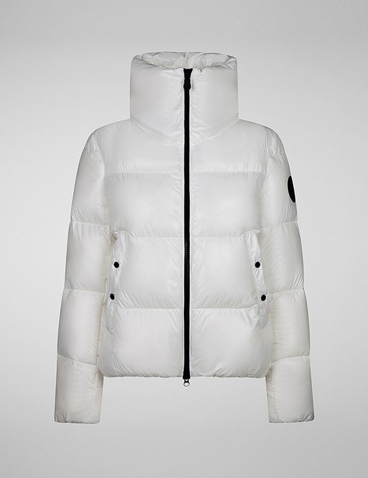 Slogan "ANIMAL FREE" che riveste la chiusura centrale con zip. Realizzato con tessuti interamente Animal Free, ha un guscio lucido bianco, trapuntato e imbottito. Il design presenta collo alto, zip frontale, tasche laterali e dettaglio logo sulla manica.