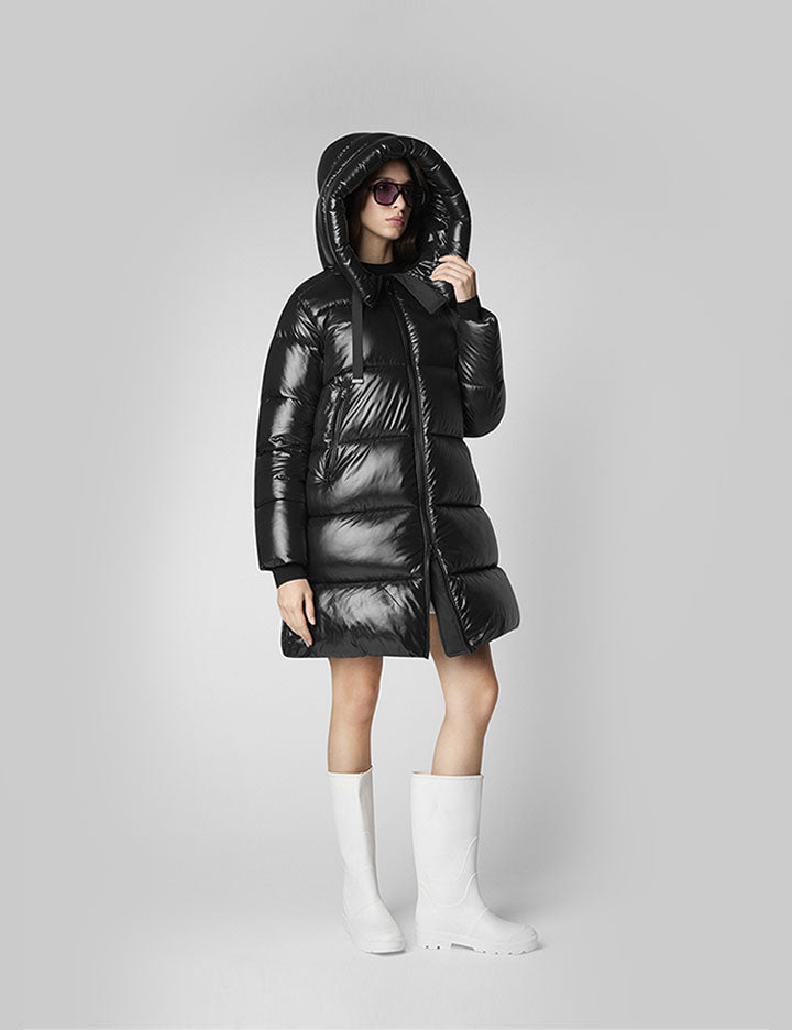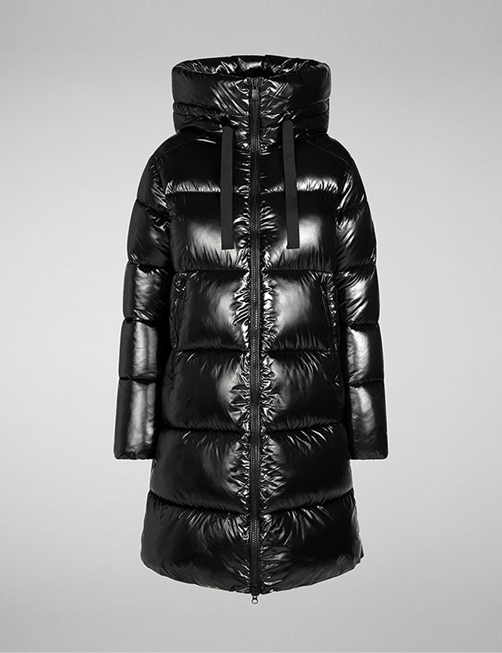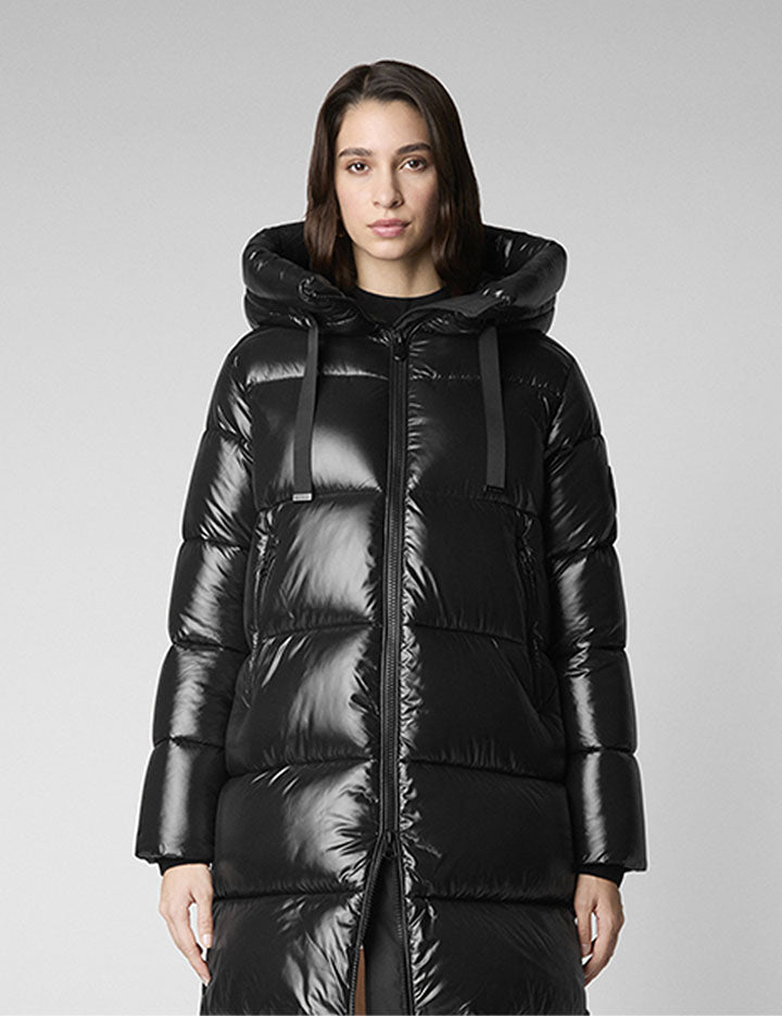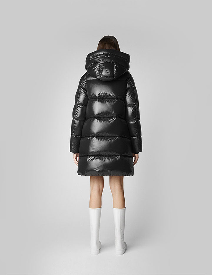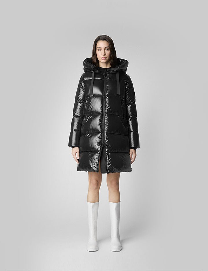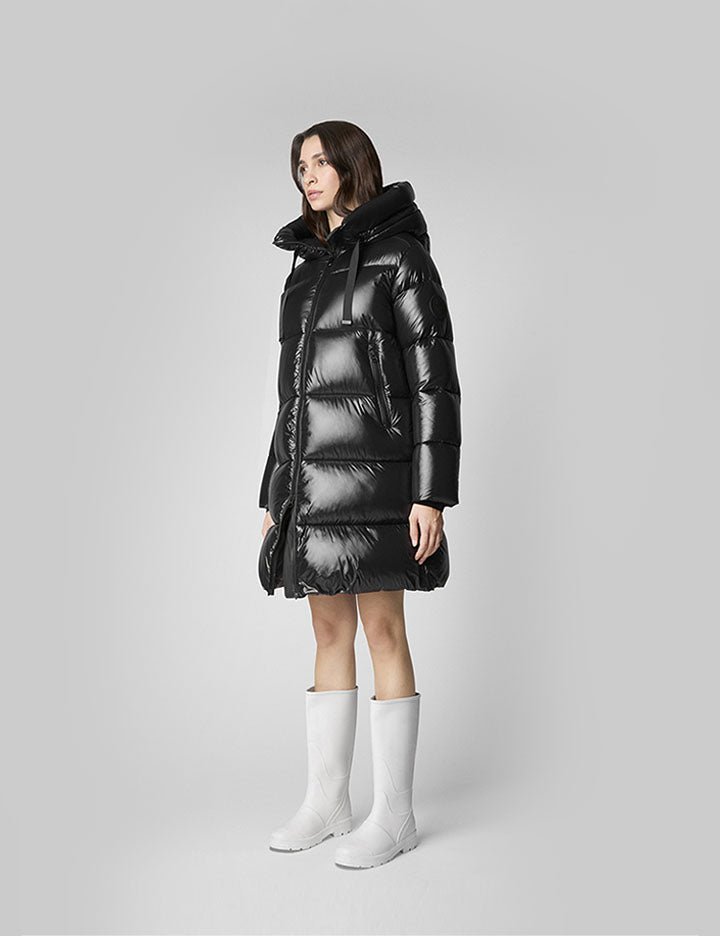 Con la sua lunga lunghezza e la finitura lucida, il piumino Isabel rappresenta un approccio moderno al capospalla. Ha l'imbottitura in piuma Animal Free, il cappuccio con coulisse, il collo alto, la chiusura frontale con cerniera e le pratiche tasche con cerniera.