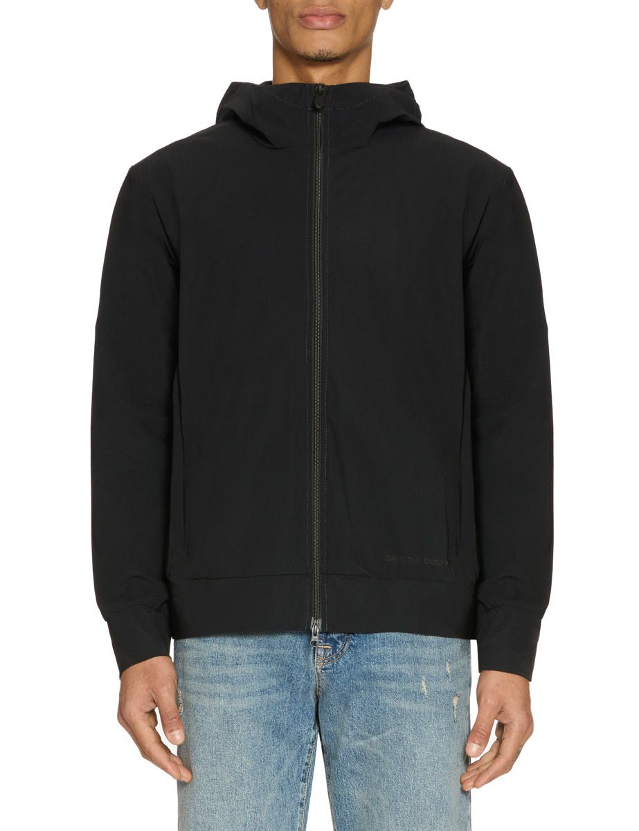 Giacca in tessuto tecnico nero, chiusura frontale con zip spiralata. Collo montante con cappuccio, dettaglio tasche frontali con chiusura a zip e dettaglio fondo e polsi in tessuto tecnico elasticizzato. Logo ton sur ton frontale.