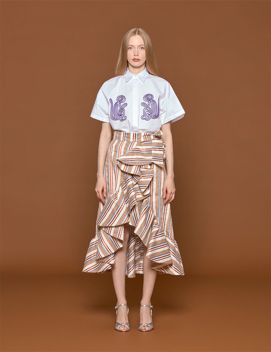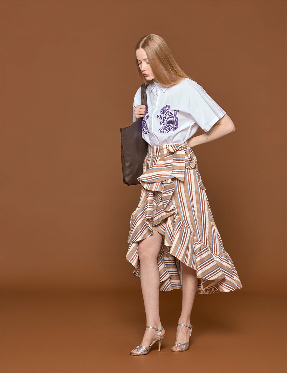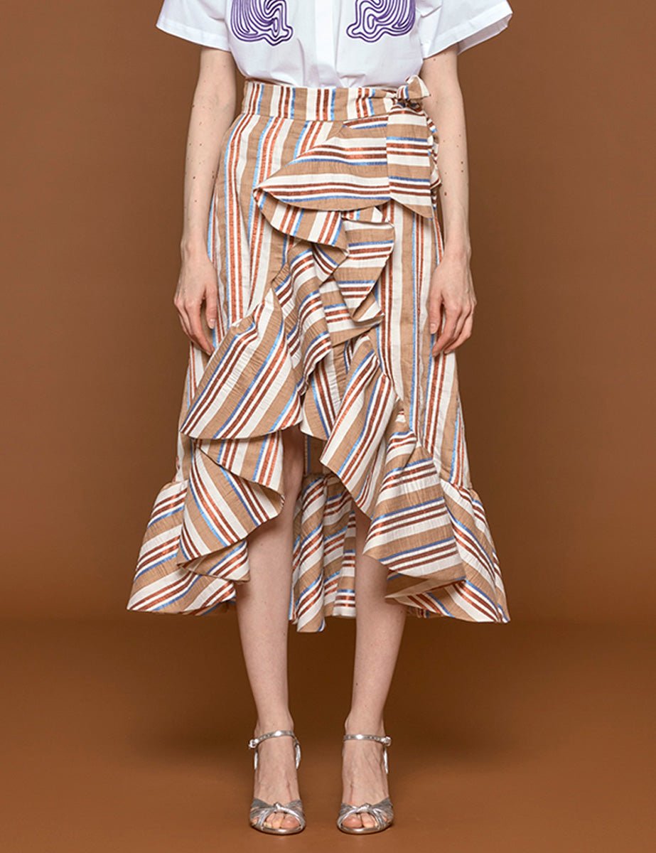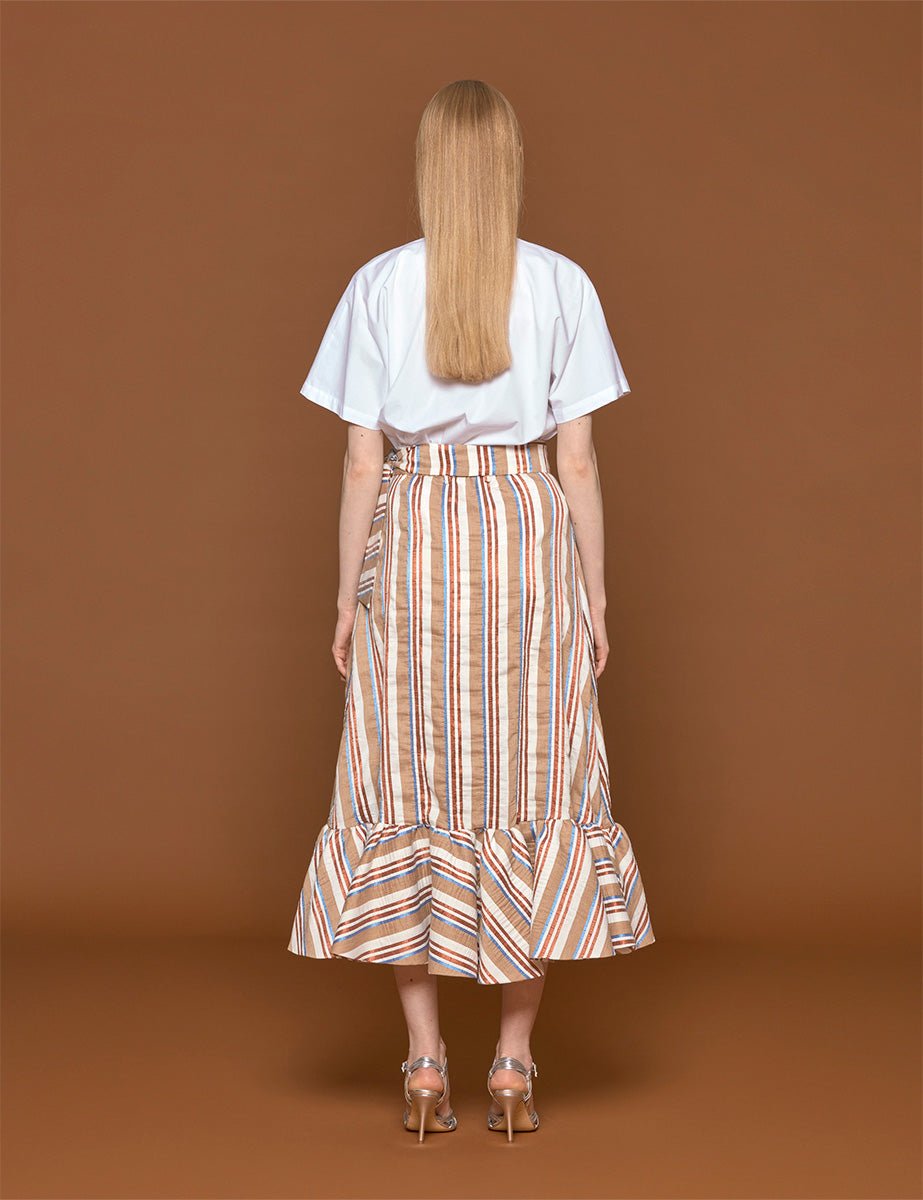 Gonna portafoglio non apribile, asimmetrica più lunga dietro, con maxi balza e cintura nello stesso tessuto staccabile. Chiusura zip sul fianco e riga multicolor latte, camel, tabacco e turquoise.