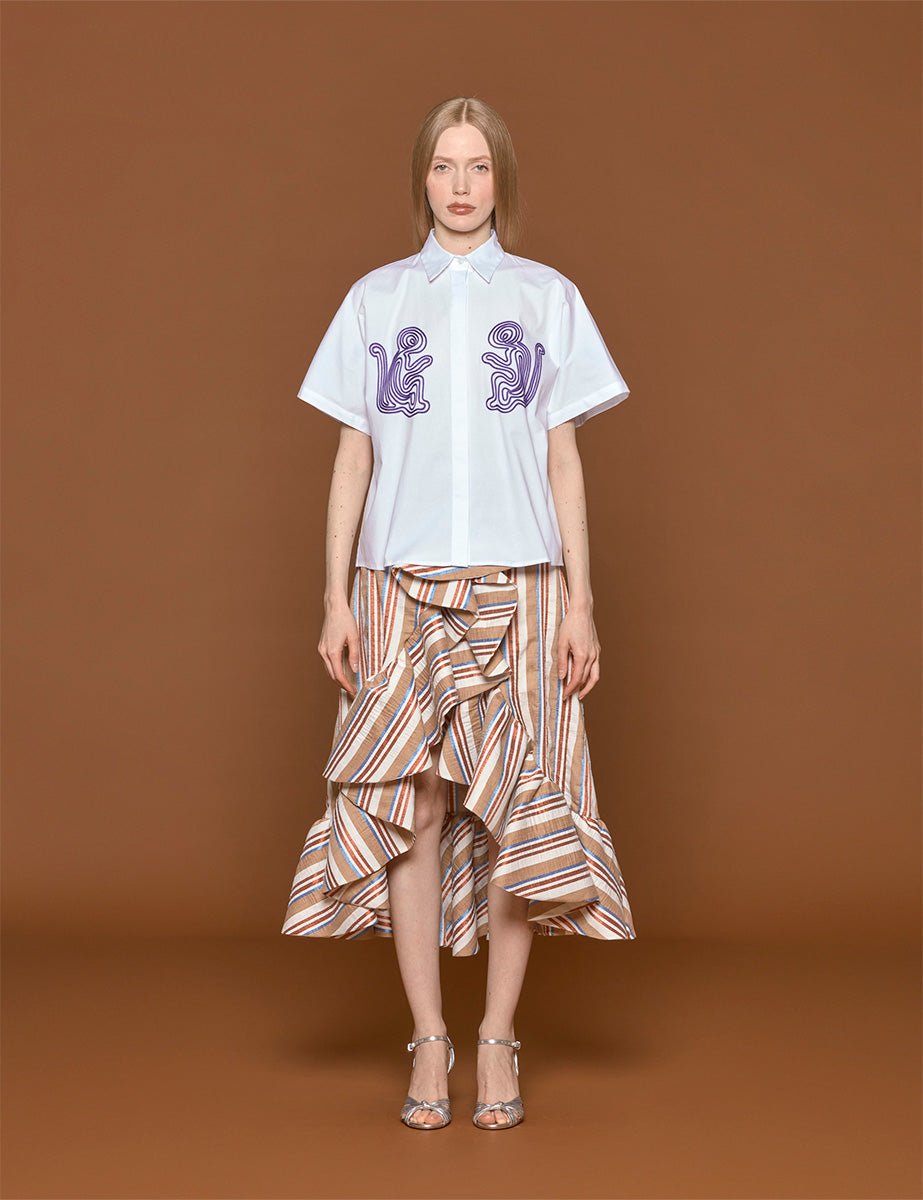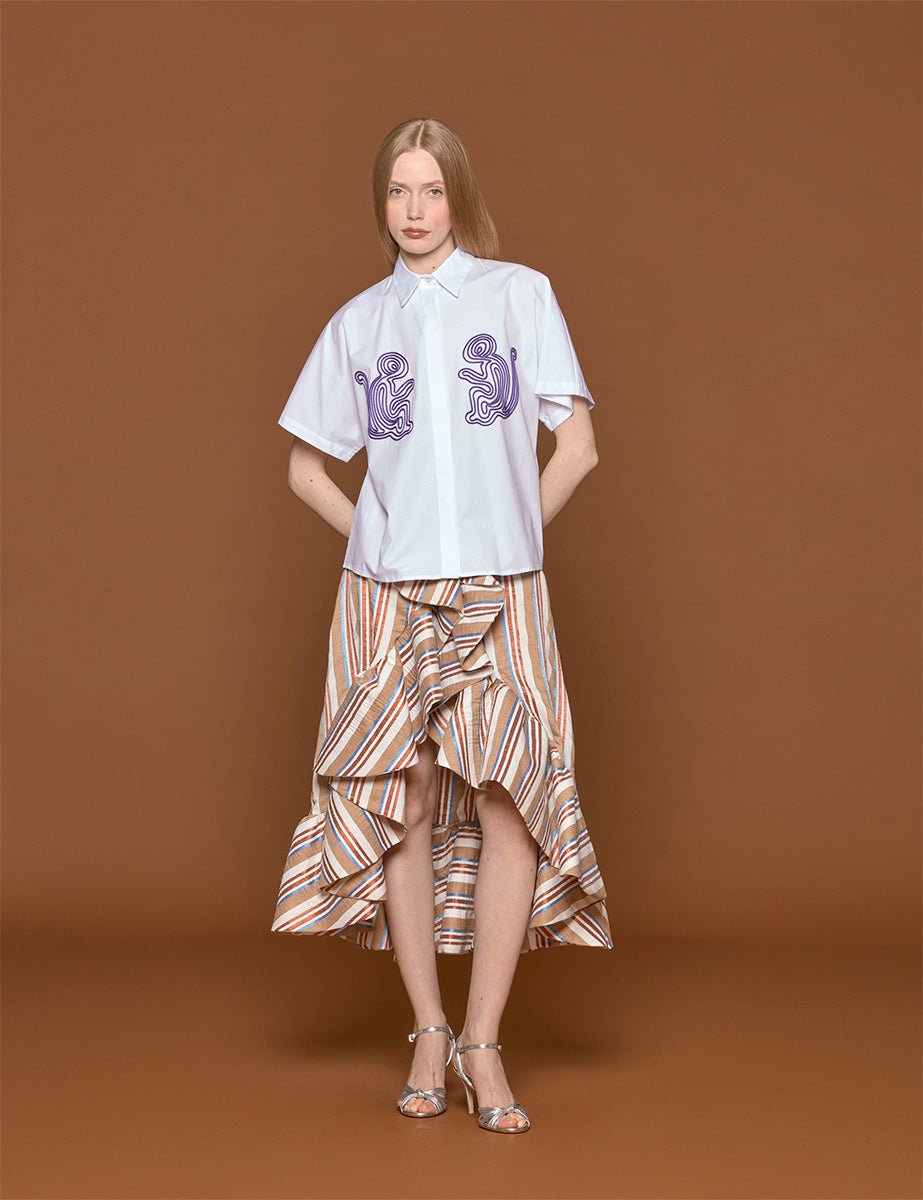 Camicia a maniche corte in popeline di cotone bianco, chiusura abbottonatura nascosta, colletto classico e ricamo speculare monkey a contrasto viola.
