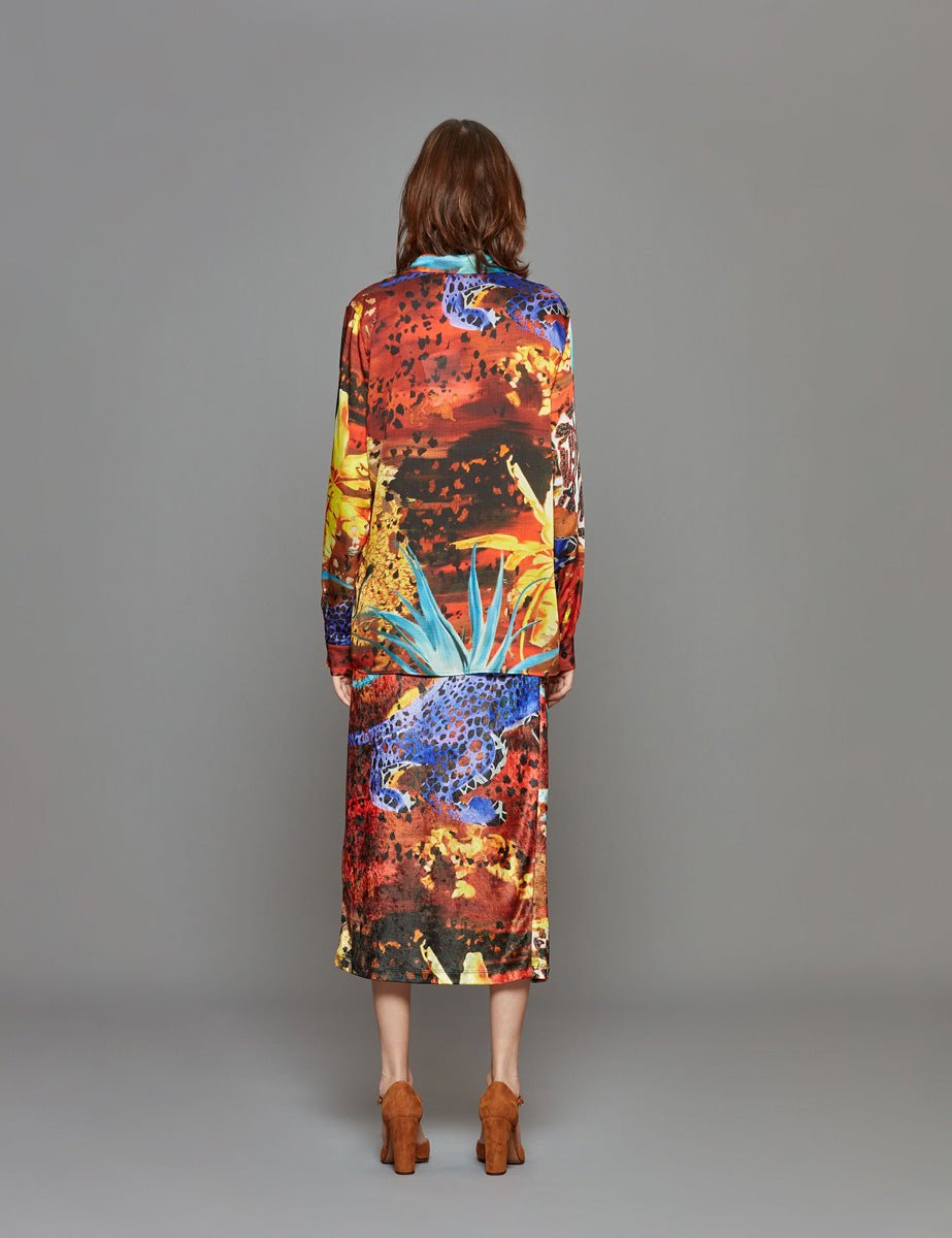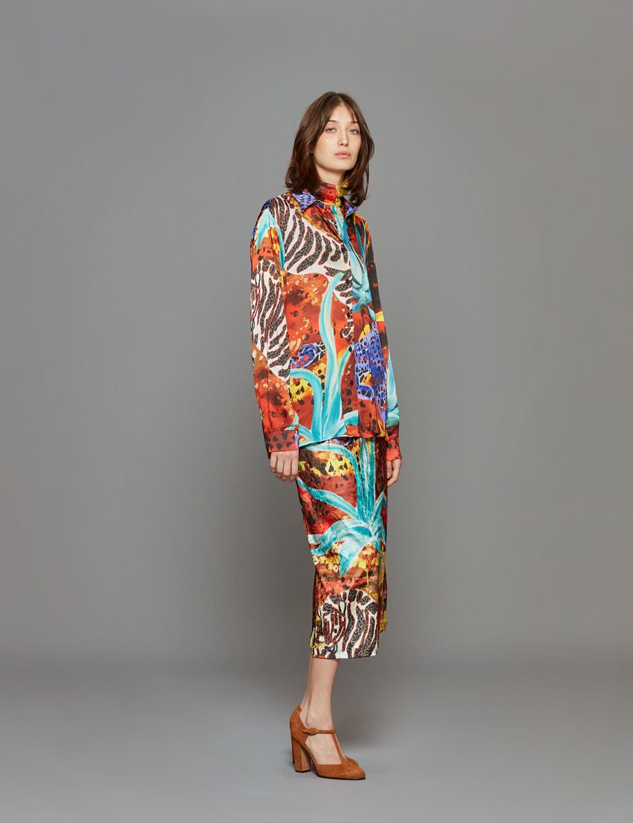 Camicia fluida con stampa etnica multicolor, abbottonatura frontale e collo e polsi a camicia.