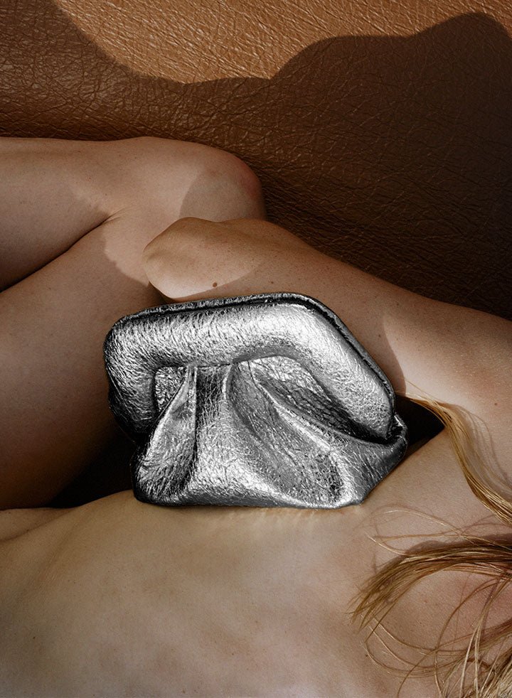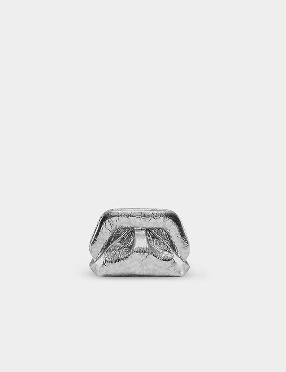 Realizzata nella variante argento, questa borsa presenta un design stondato con drappeggio, dettagli con arricciature e un unico scomparto interno, chiusura magnetica e tracolla regolabile e rimovibile.