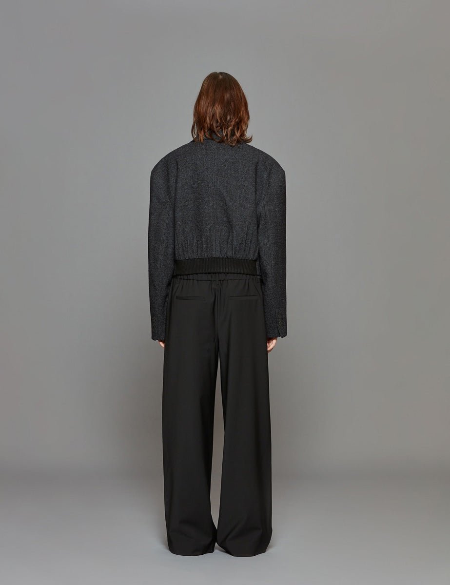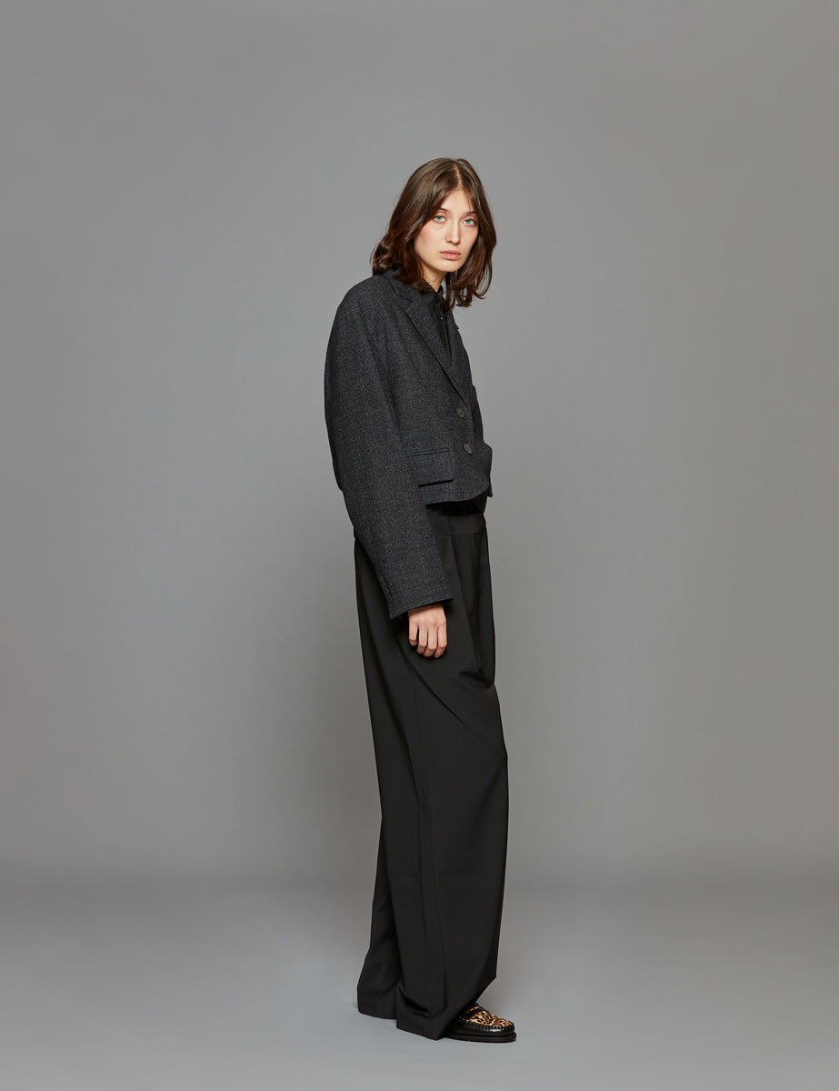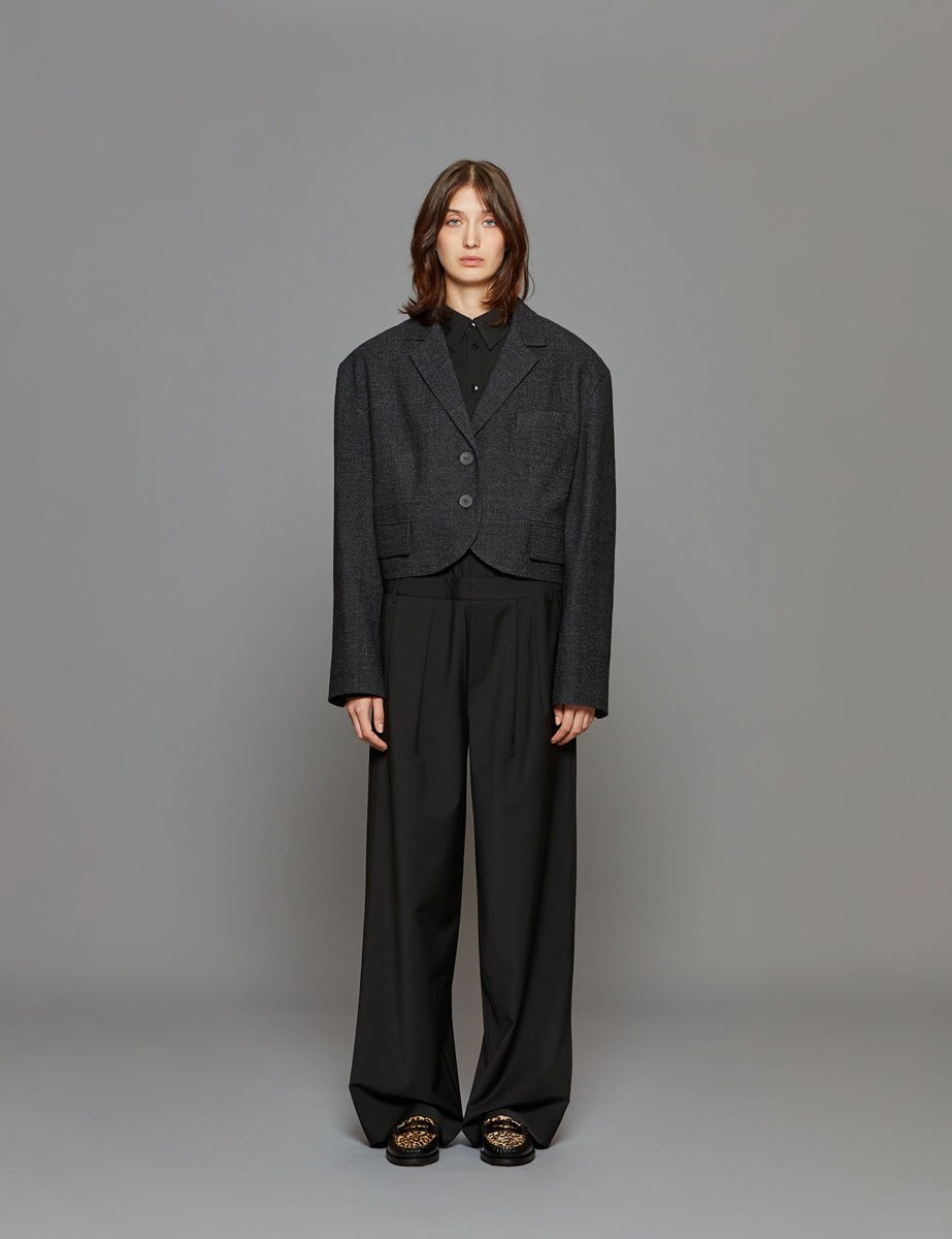 Giacca crop in lana grigio scuro con motivo principe di galles, collo a revers, chiusura monopetto con bottoni in corno, volume destrutturato con spalla scesa, tasca a filetto alta e tasche frontali con patta. Chiusura polsi con bottoni e fondo con smacchinato a costa sul retro.