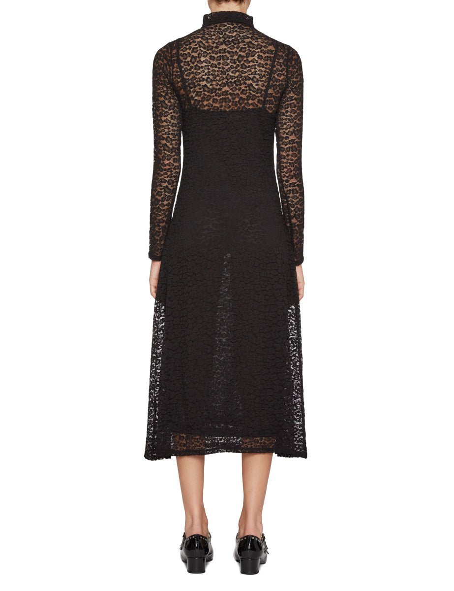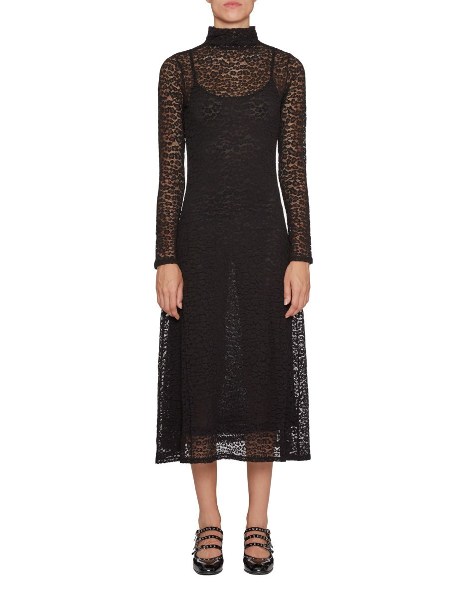 Abito midi in pizzo con motivo animalier ton sur ton nero. Volume svasato ad “A”, collo alto e manica a guanto. Con sottoveste in tono.