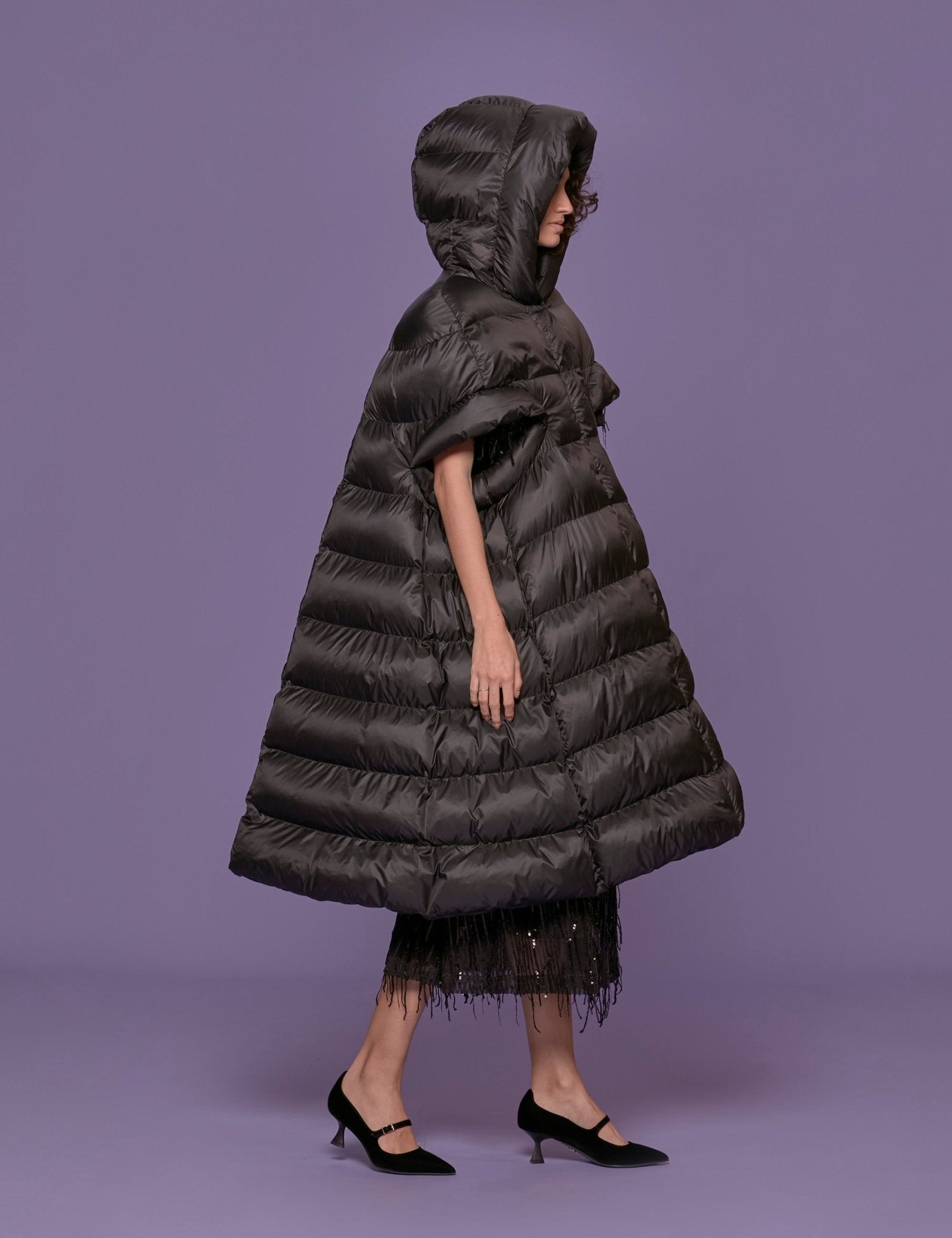 Piumino cappa lungo in poliestere targato Vivetta. Presenta imbottitura a listini orizzontali, cappuccio e dettaglio apertura sui lati.