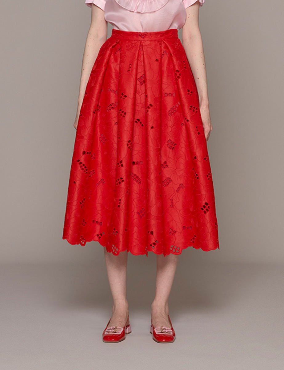 Gonna rossa in popeline di cotone con tasche sui fianchi, ricamo simil macramè con elementi cut out, smerlo sul fondo e chiusura a zip sul retro.