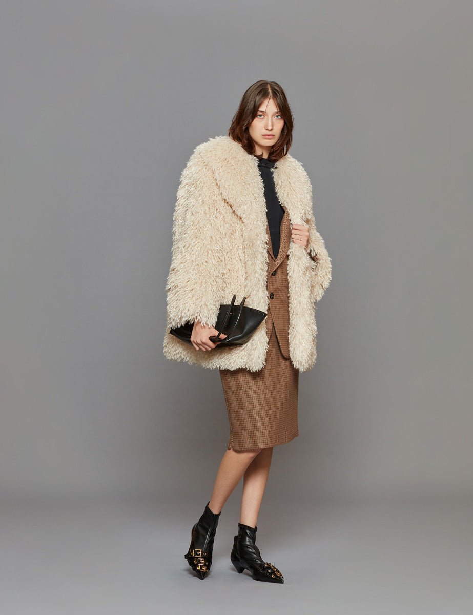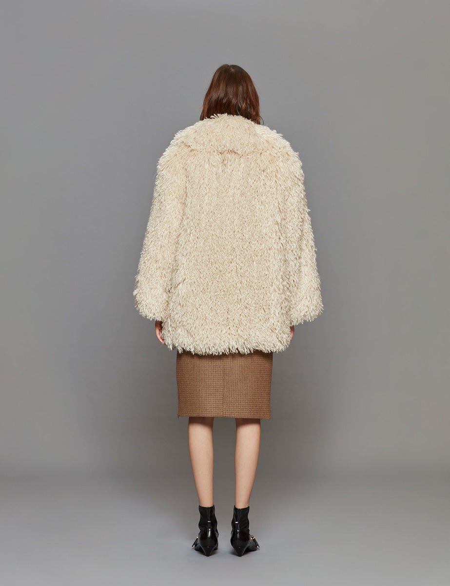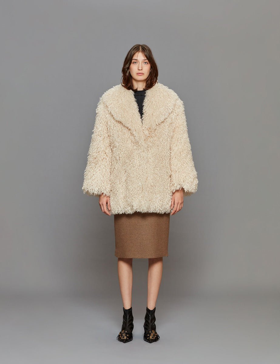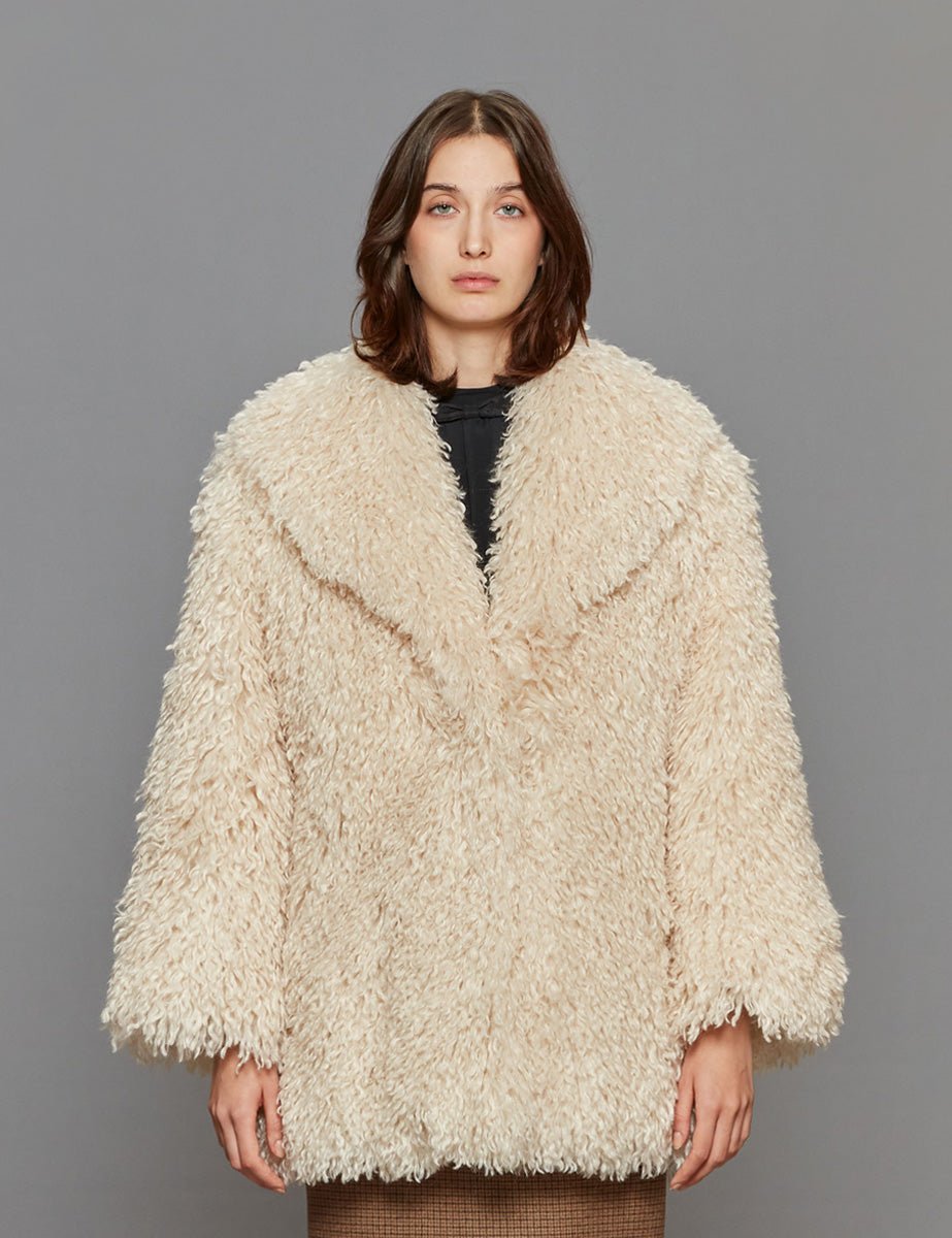 Ecopelliccia over color avorio, collo a scialle e pelo lungo dall’aspetto mosso.