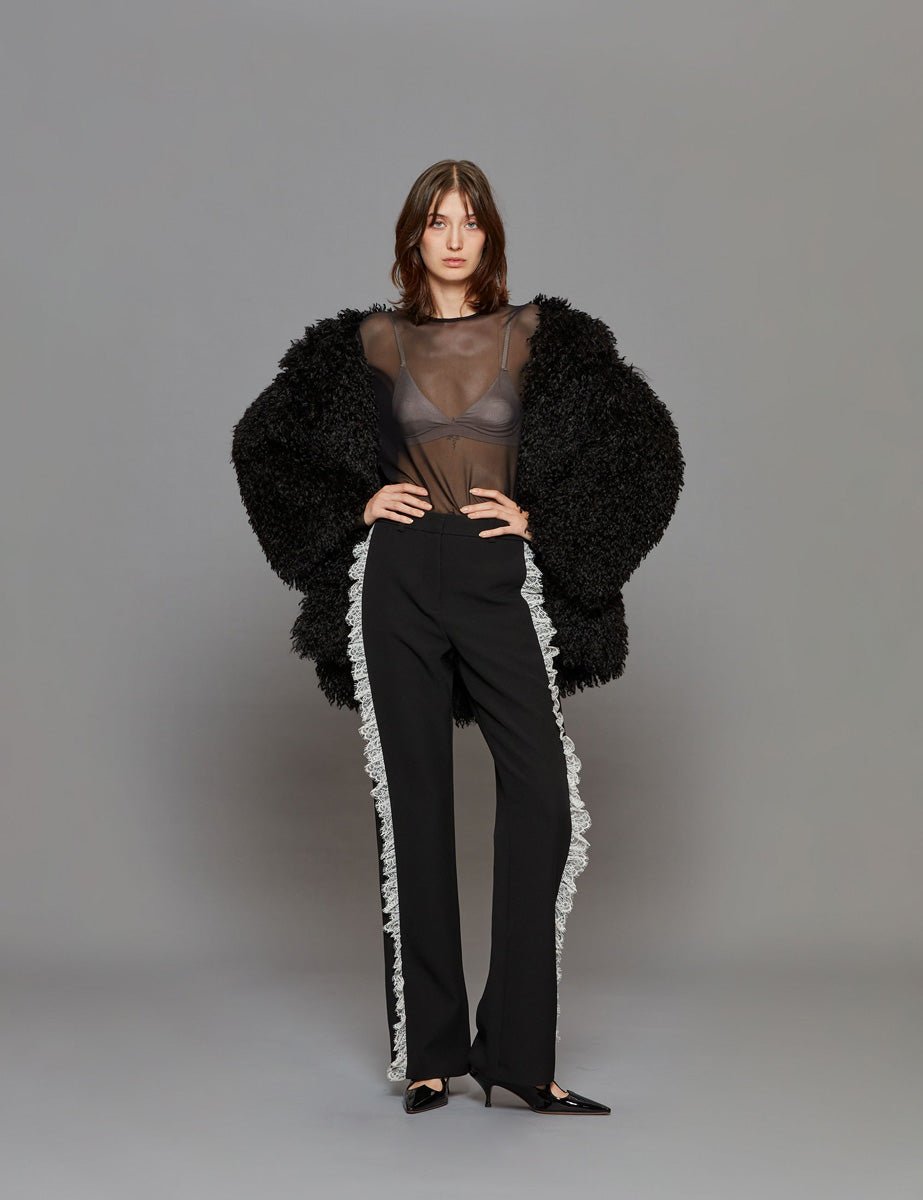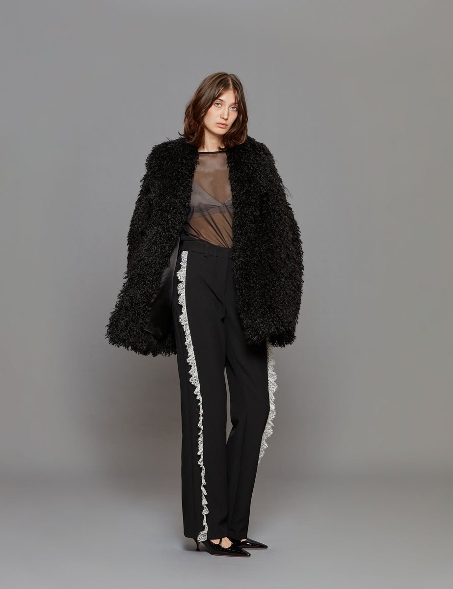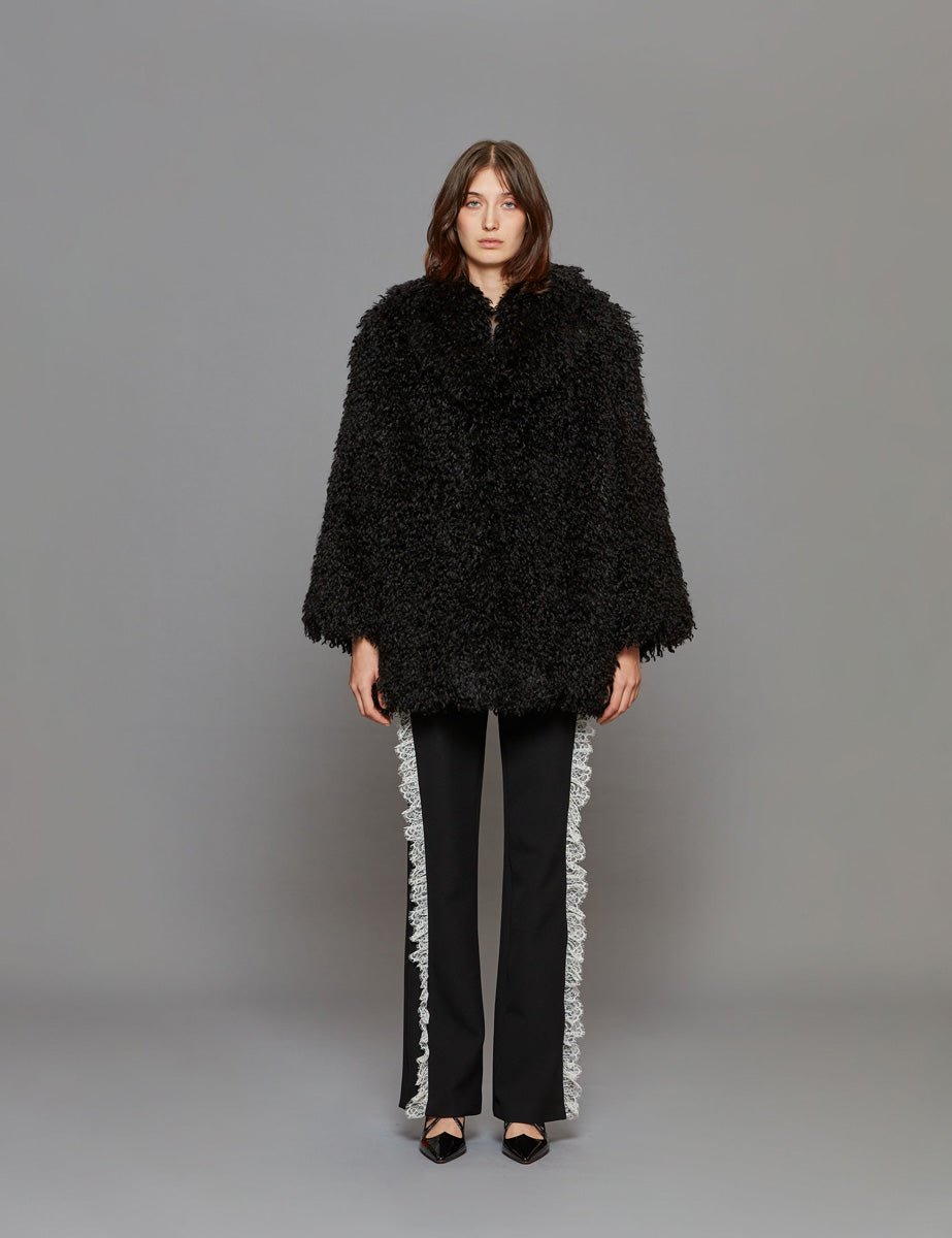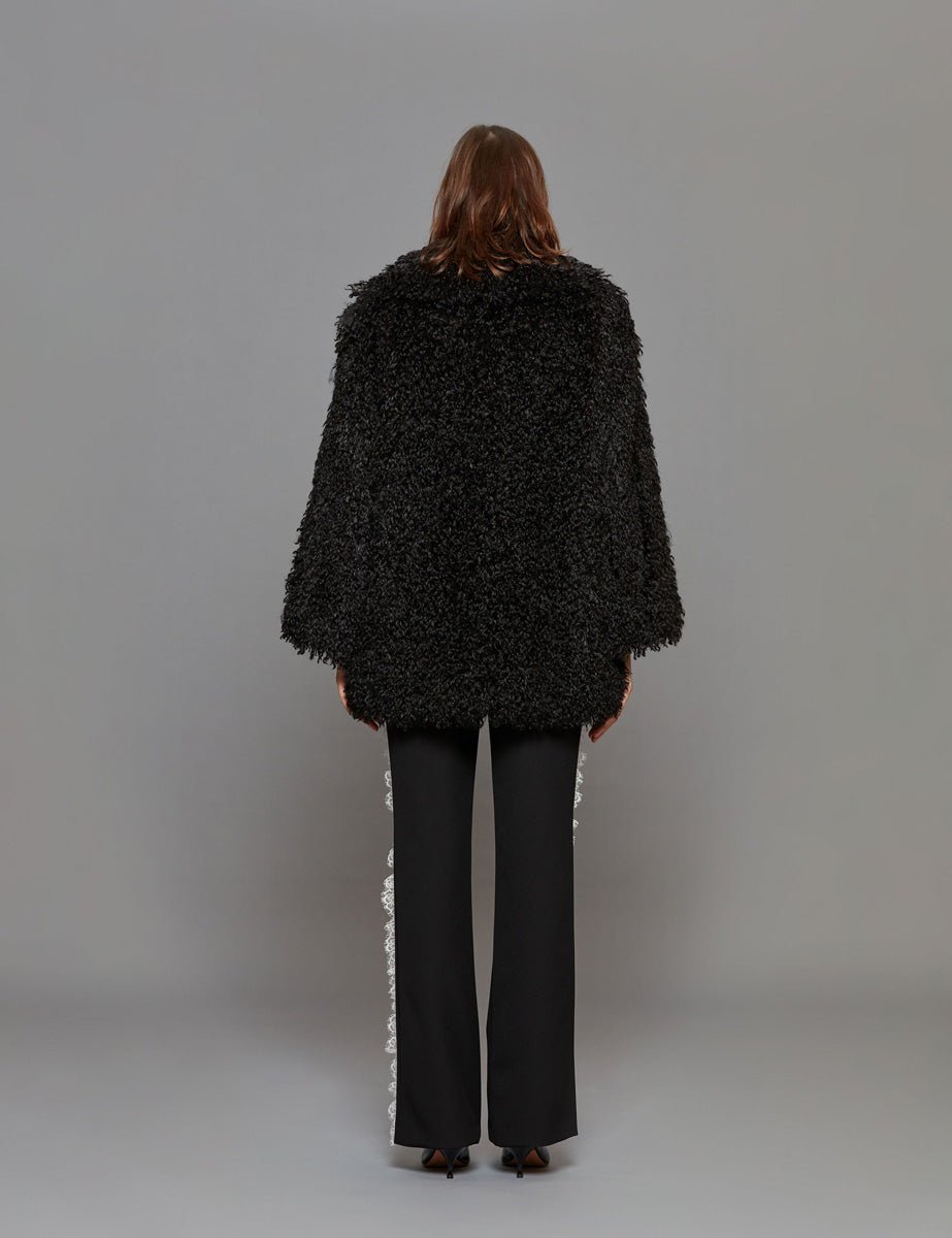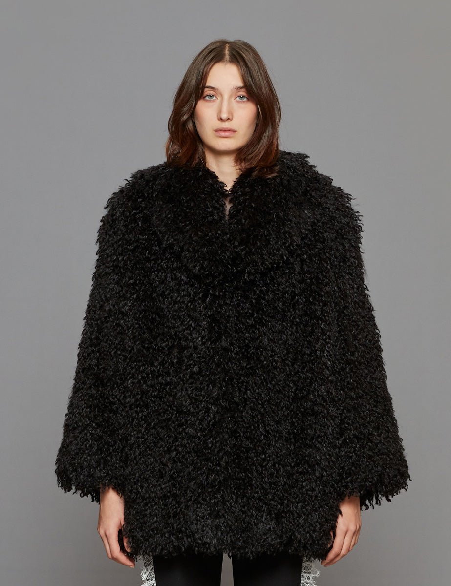 Ecopelliccia over nera, collo a scialle e pelo lungo dall’aspetto mosso.