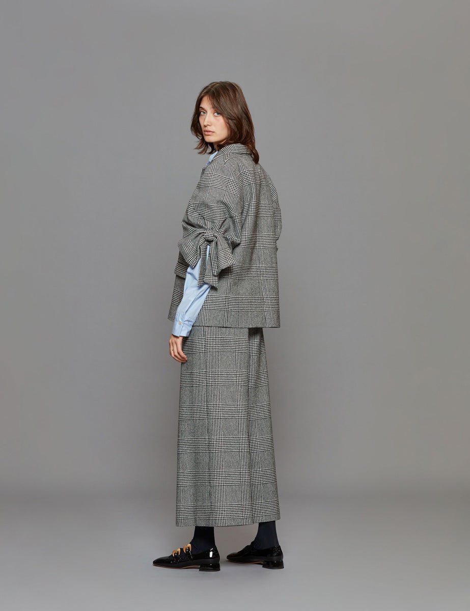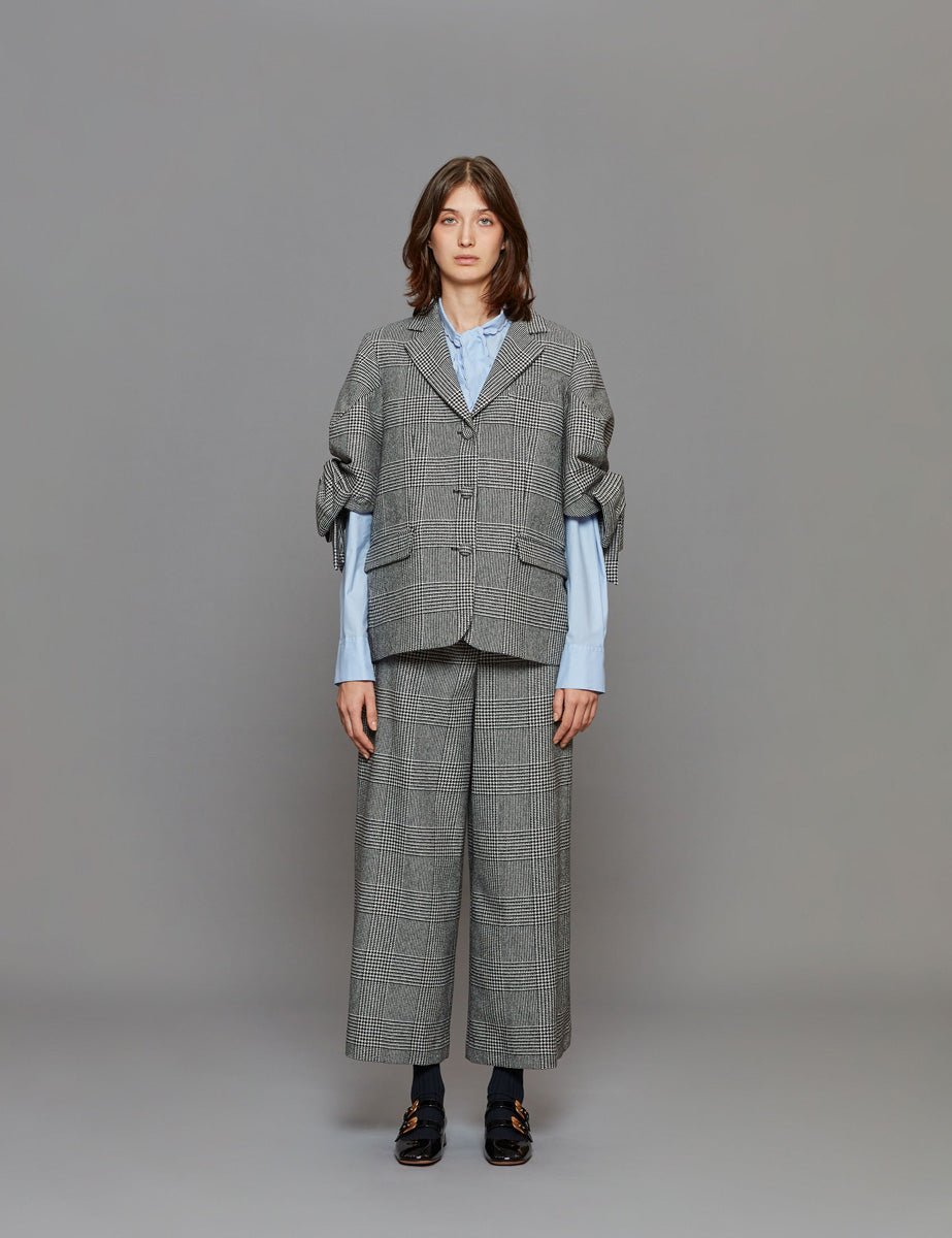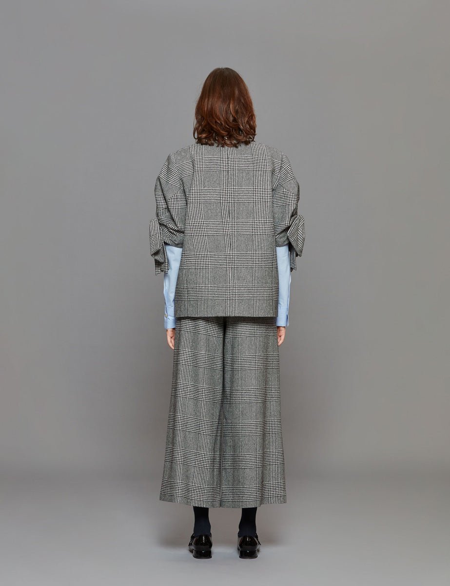Blazer in principe di galles bianco e nero, collo revers, manica corta costruita con motivo a fiocco al fondo, chiusura monopetto con bottoni ricoperti in tono, tasche a patta sul davanti e spacco centrale sul retro.