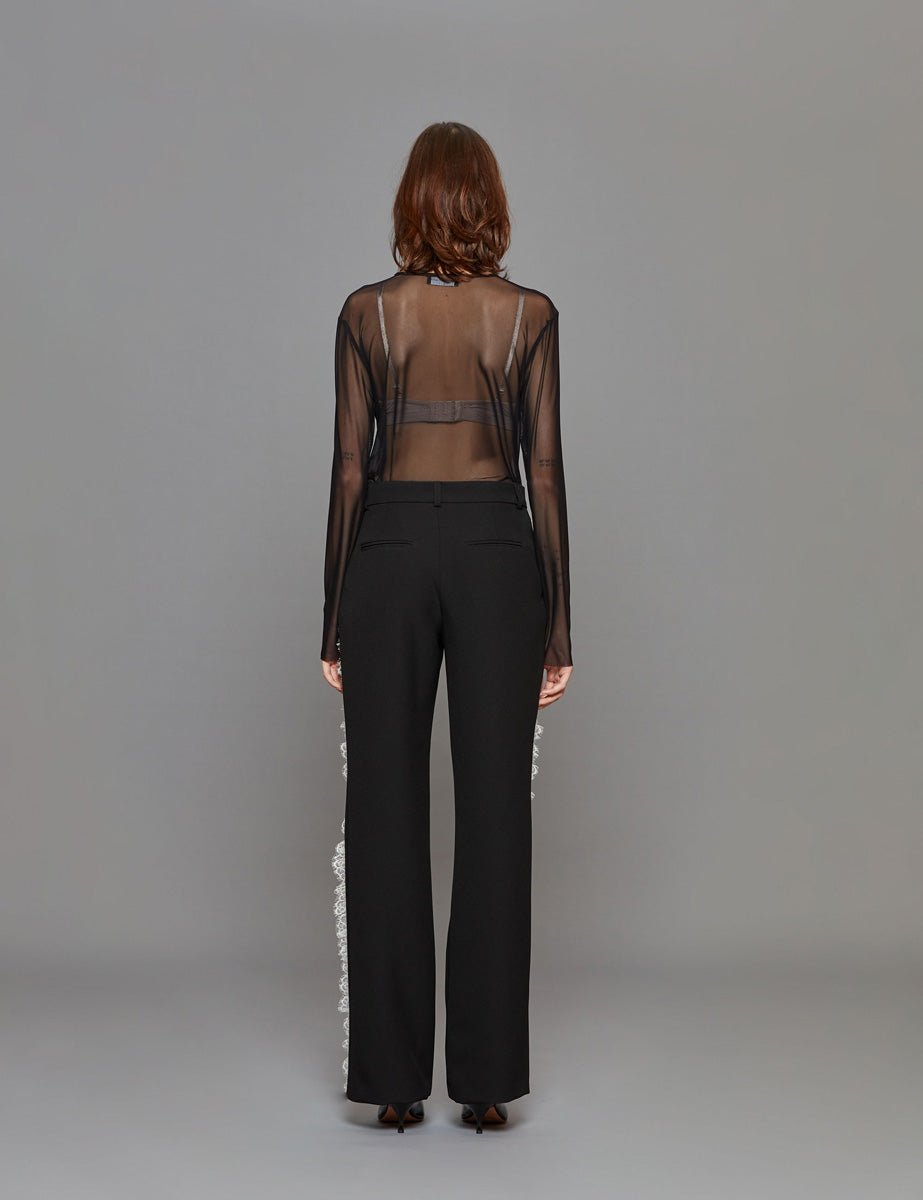 Pantalone in cady nero, gamba dritta con inserti a contrasto in pizzo a contrasto bianco, chiusura gancio e zip sul davanti, tasche alla francese sul davanti e a doppio filetto sul retro.